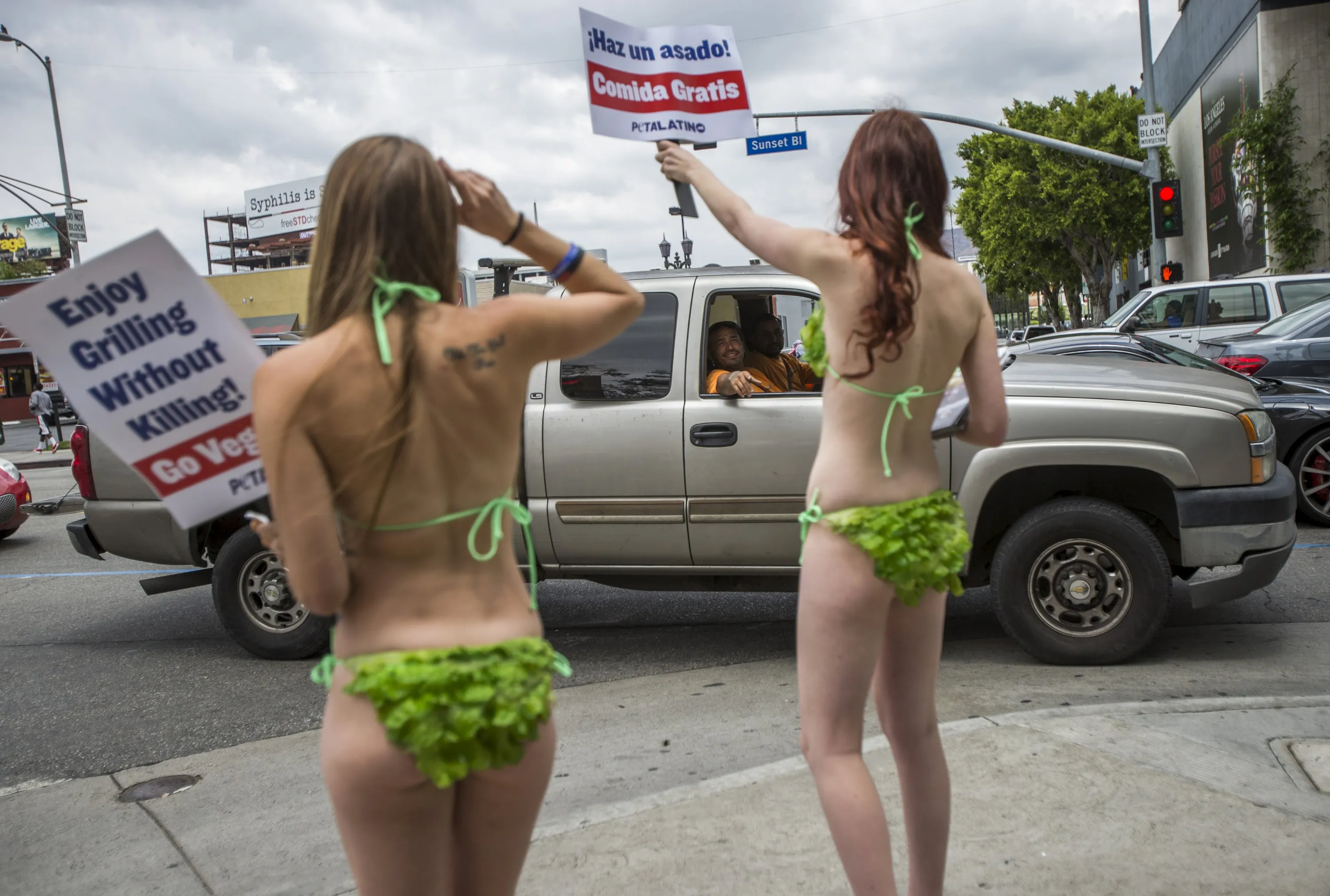 Activists from People for the Ethical Treatment of Animals (PETA) hold signs promoting a vegan diet as people drive past in Los Angeles, California May 21, 2015. (Photo by Mario Anzuoni/Reuters)