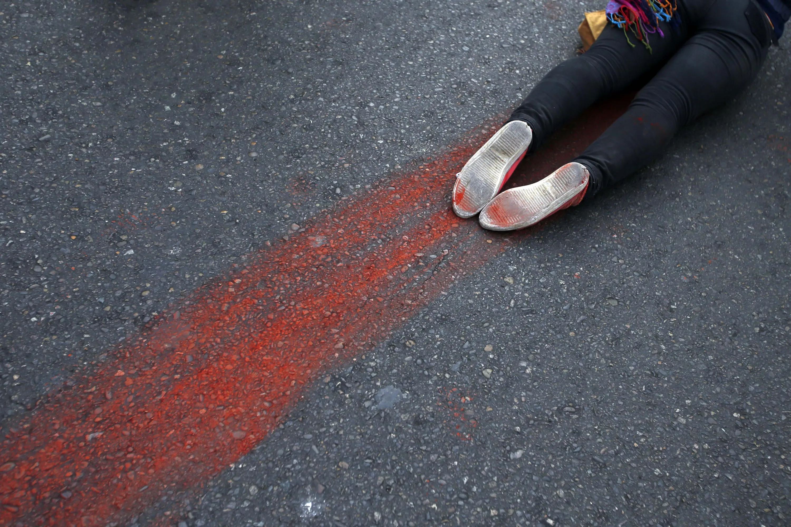 A protester performs the symbolic death of a student demonstrator during a march near Congress where Chile's President Michelle Bachelet gives her annual address in Valparaiso, Chile, Thursday, May 21, 2015. Demonstrators are protesting the death of two students killed during an education reform march last week in Valparaiso and demanding more involvement in education reform. (Photo by Luis Hidalgo/AP Photo)