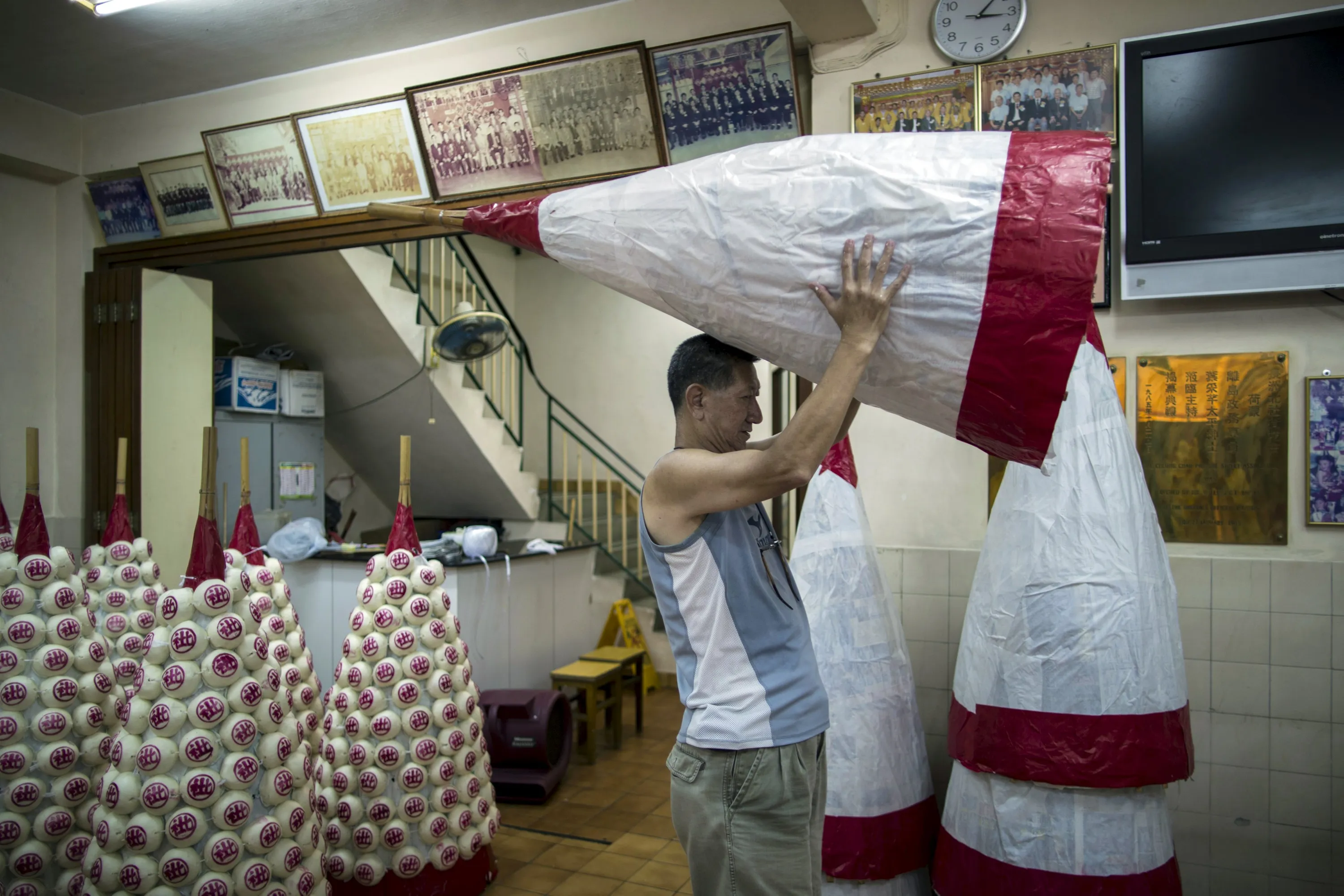 A worker lifts up a small “Bun Mountain”, at Hong Kong's Cheung Chau island, China May 20, 2015, ahead of the upcoming Bun Festival on May 25. (Photo by Tyrone Siu/Reuters)