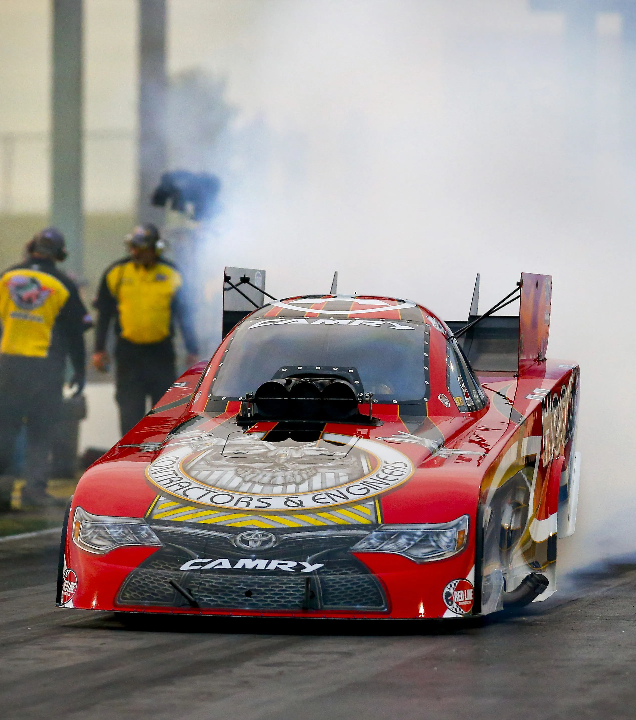 Chad Head takes his Funny Car through its burnout before the second run of the 2015 NHRA Kansas Nationals, Friday May 22, 2015, at Heartland Park in Topeka, Kan. (Photo by Chris Neal/The Topeka Capital-Journal via AP Photo)
