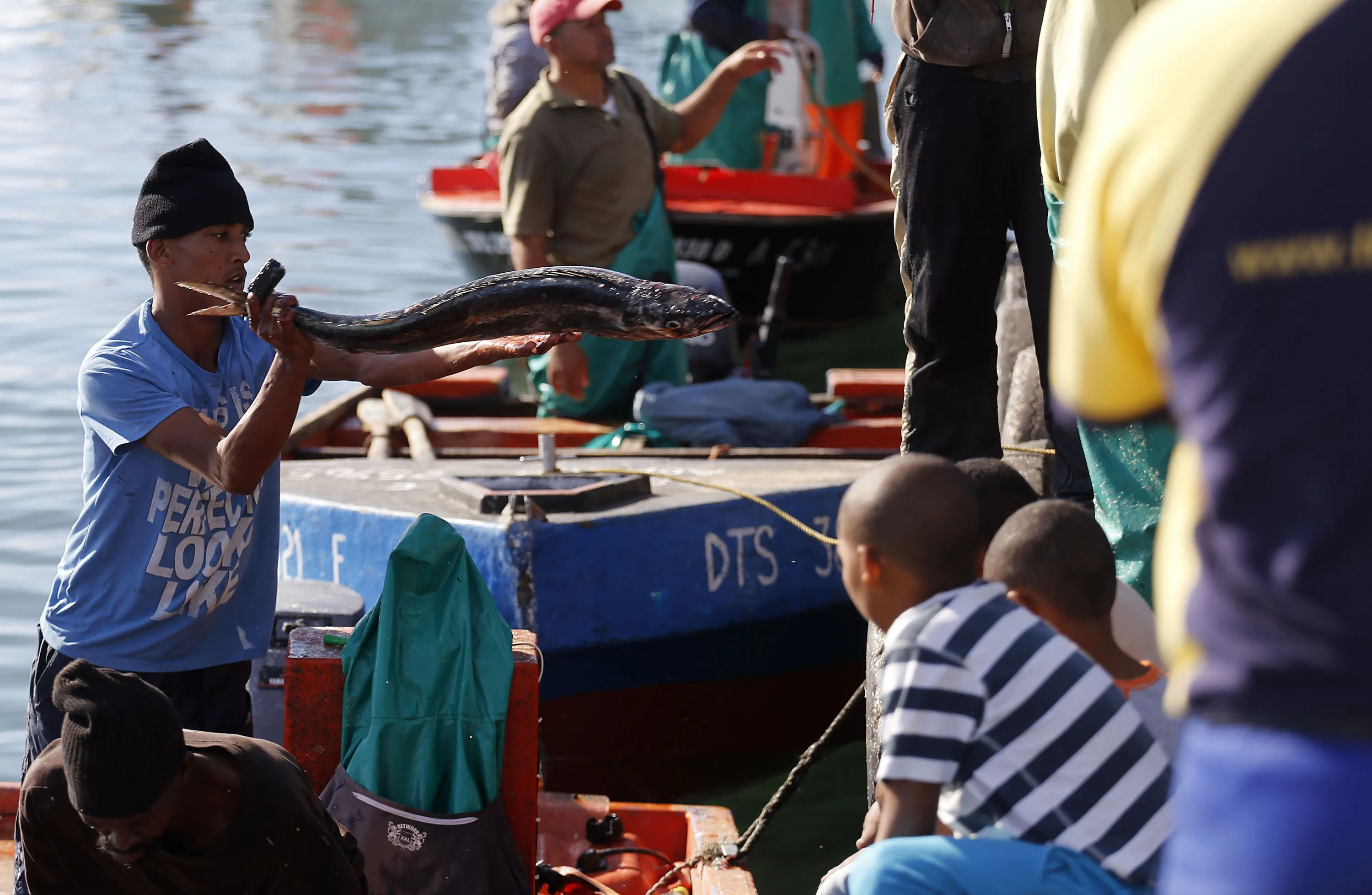 In this photo taken on Saturday, May 16, 2015, snoek fish is offloaded from a boat for cleaning in Lambert's Bay, South Africa. The boats line up along the jetty, bobbing in the cold south Atlantic waters, bringing in the day's catch in the early afternoon. The long silver snoek fish is one of South Africa's traditional foods, and a main source of income for the town of Lambert's Bay. (Photo by Schalk van Zuydam/AP Photo)