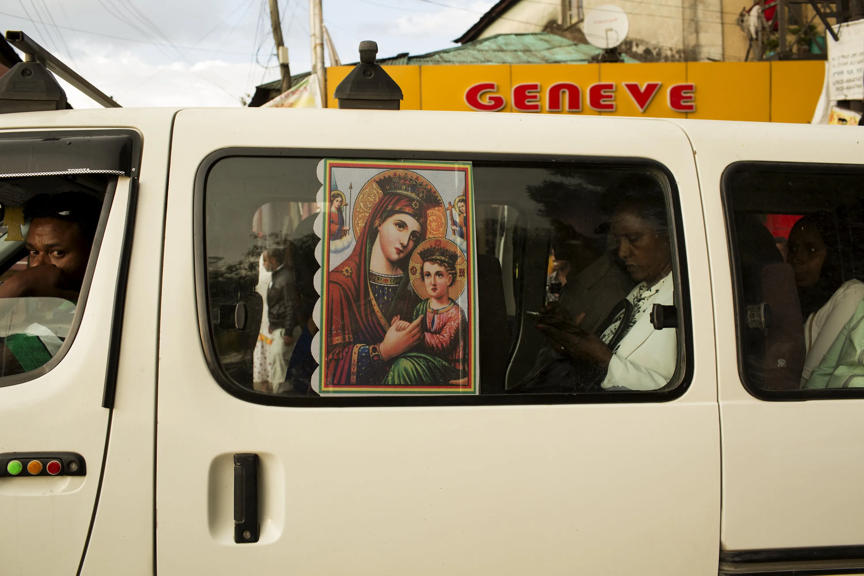 A poster depicting the Virgin Mary and her son Jesus Christ is seen on a window of a public transport minivan in Addis Ababa, Ethiopia, May 17, 2015. (Photo by Siegfried Modola/Reuters)