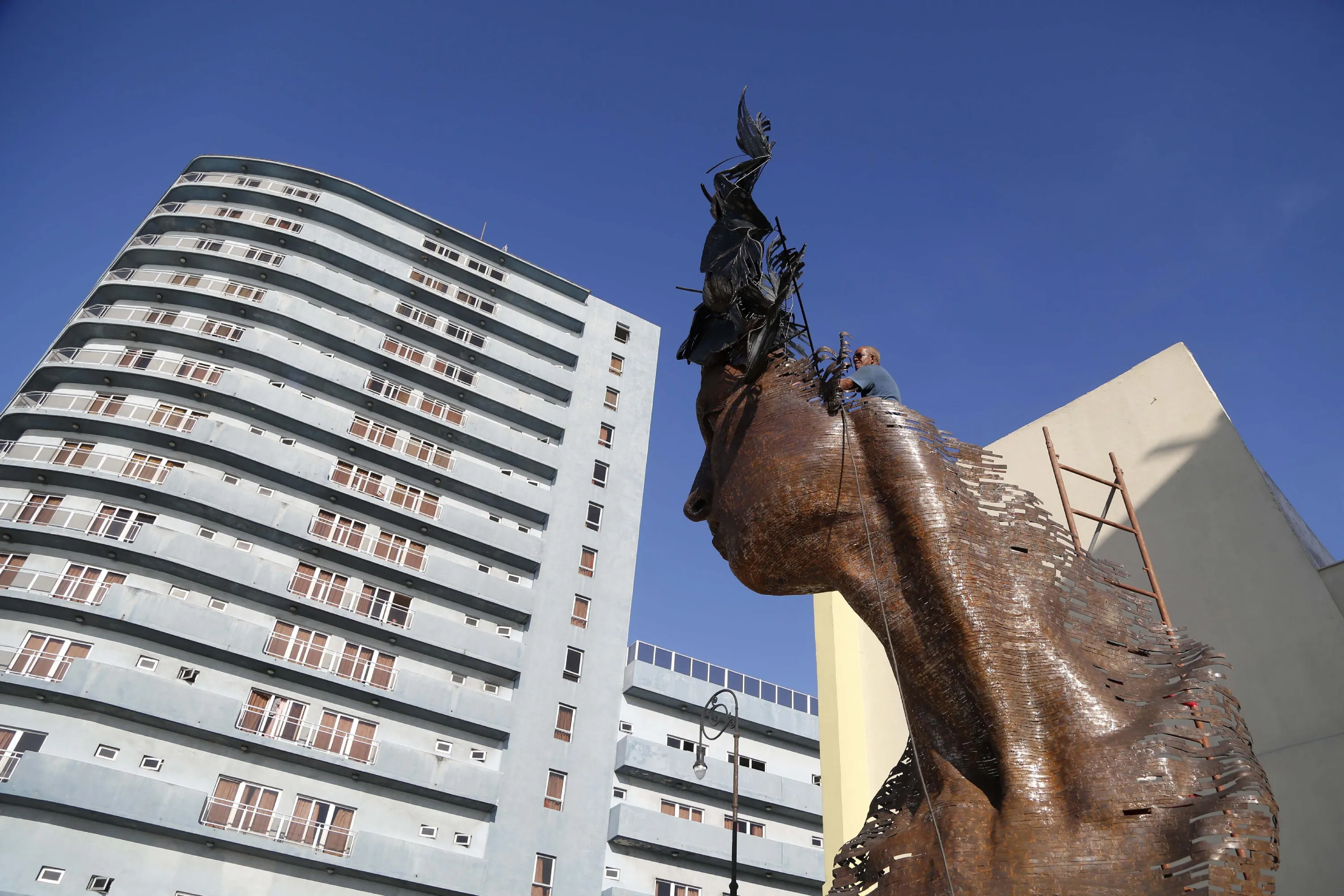 A worker gives the final touches to “Primavera”, a creation dedicated to Cuban women, by Cuban artist Rafael San Juan in Havana, Cuba, Saturday, May 23, 2015. The sculpture is part of the month long Havana Biennial Art Fair. The event opened Friday with works by artists from 40 countries at museums, galleries and outdoor spaces around Cuba’s capital. (Photo by Desmond Boylan/AP Photo)