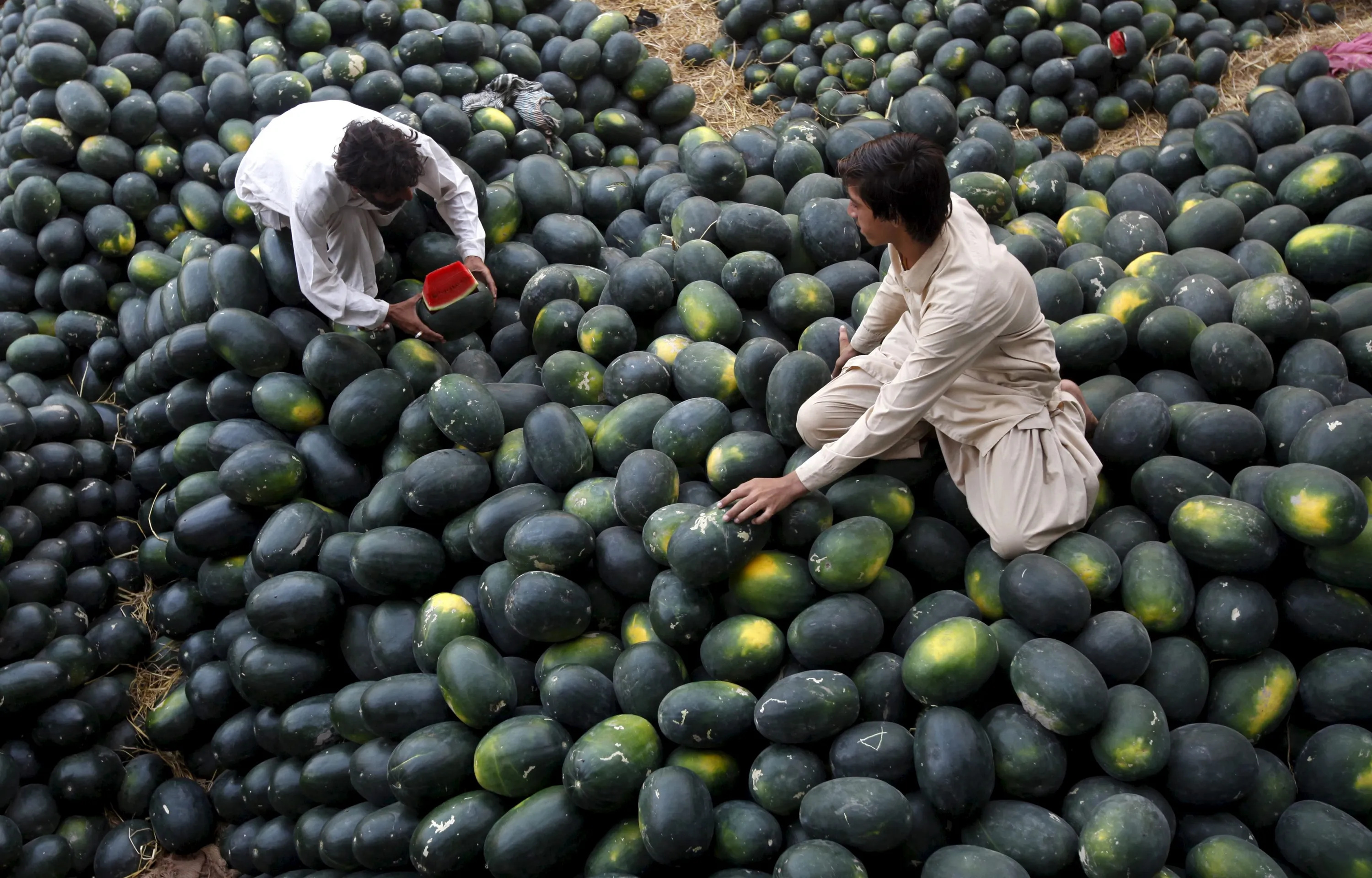 Laborers prepare watermelons to be displayed for customers at a wholesale fruit and vegetable market on the outskirts of Karachi April 22, 2015. (Photo by Athar Hussain/Reuters)