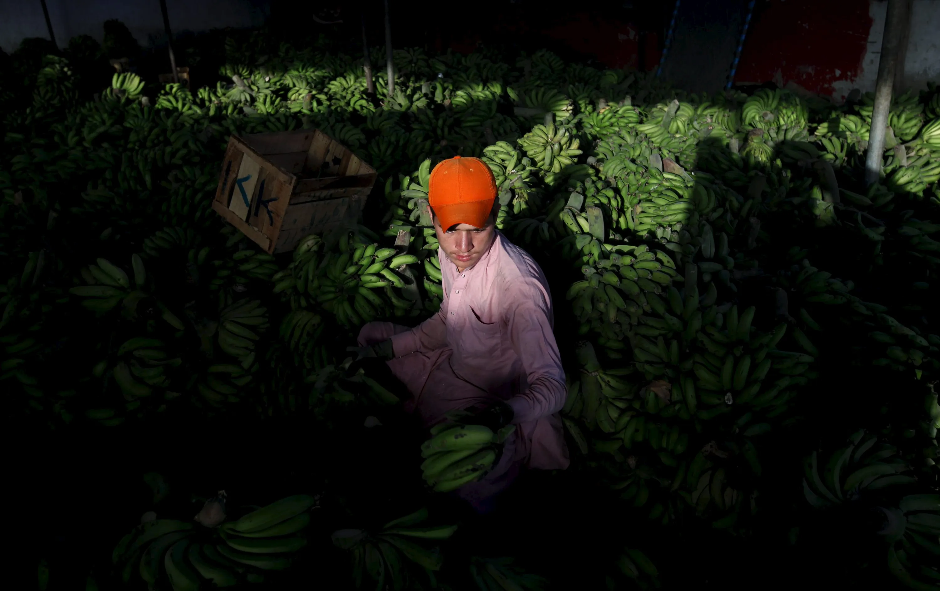 A laborer sorts bananas at a wholesale fruit and vegetable market on the outskirts of Karachi April 22, 2015. (Photo by Athar Hussain/Reuters)