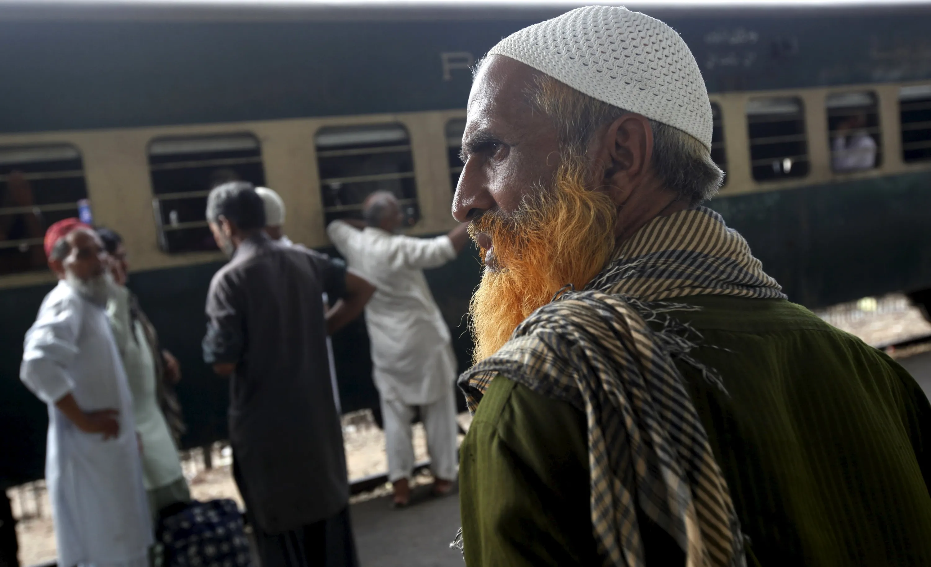 A man with a henna-dyed beard stands with others while waiting for a train to leave at Cantonment Railways Station in Karachi, Pakistan, May 25, 2015. (Photo by Akhtar Soomro/Reuters)