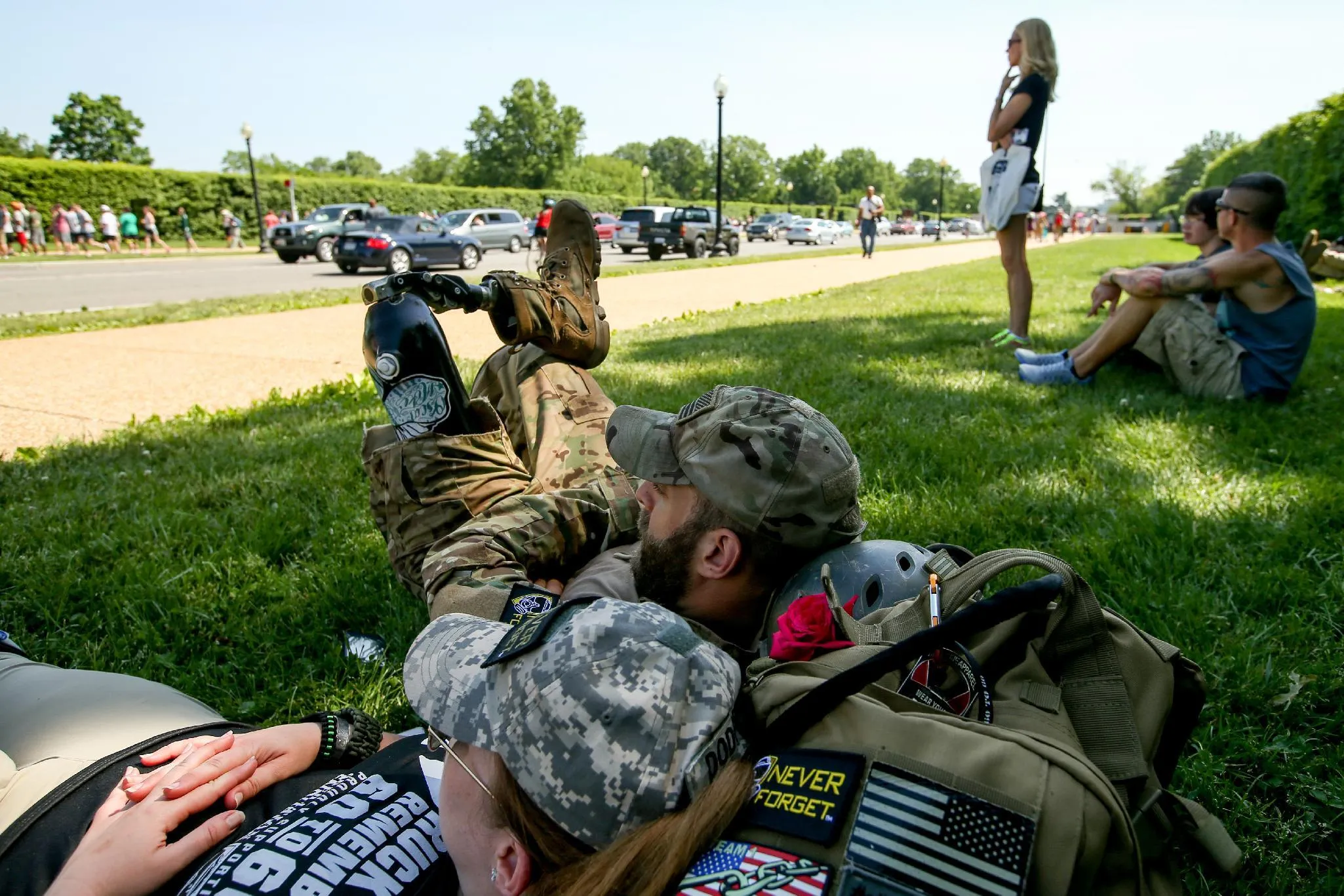 Army Staff Sgt. Earl Granville of Arlington, Va., second from left, and former Army Spc. Jessica Red of Orlando, Fla., left, rest together in the grass outside Arlington National Cemetery in Arlington, Va., Monday, May 25, 2015, on Memorial Day. The two were part of a Operation Enduring Warrior backpacking event in which dozens of people walked from Harpers Ferry, W.Va., to Arlington National Cemetery. Americans observe Memorial Day this weekend to remember the men and women who died while serving in the U.S. military. (Photo by Andrew Harnik/AP Photo)