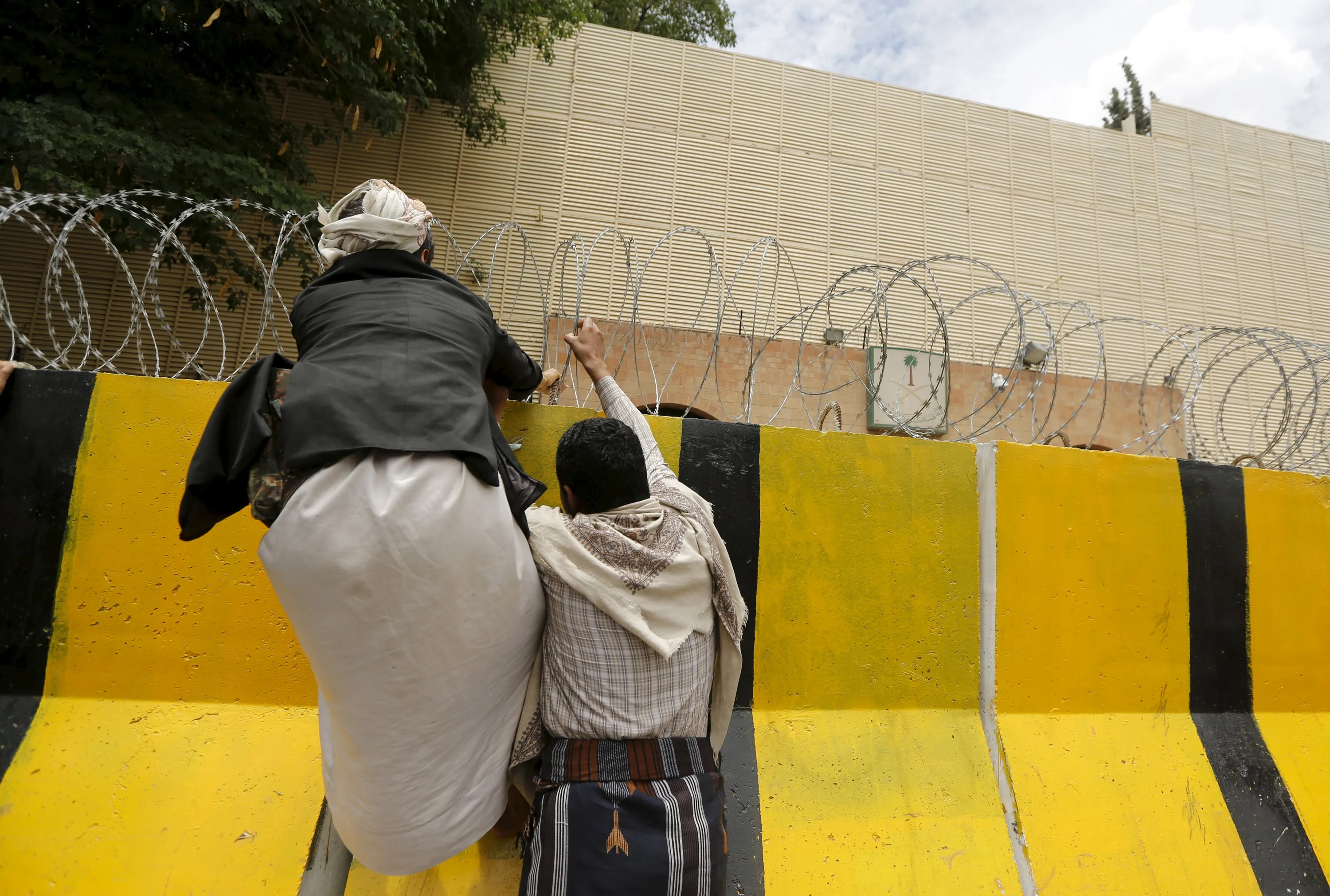 Houthi followers climb a barricade outside the Saudi embassy as they prepare to hang a banner against Saudi-led air strikes, in Sanaa May 25, 2015. (Photo by Khaled Abdullah/Reuters)