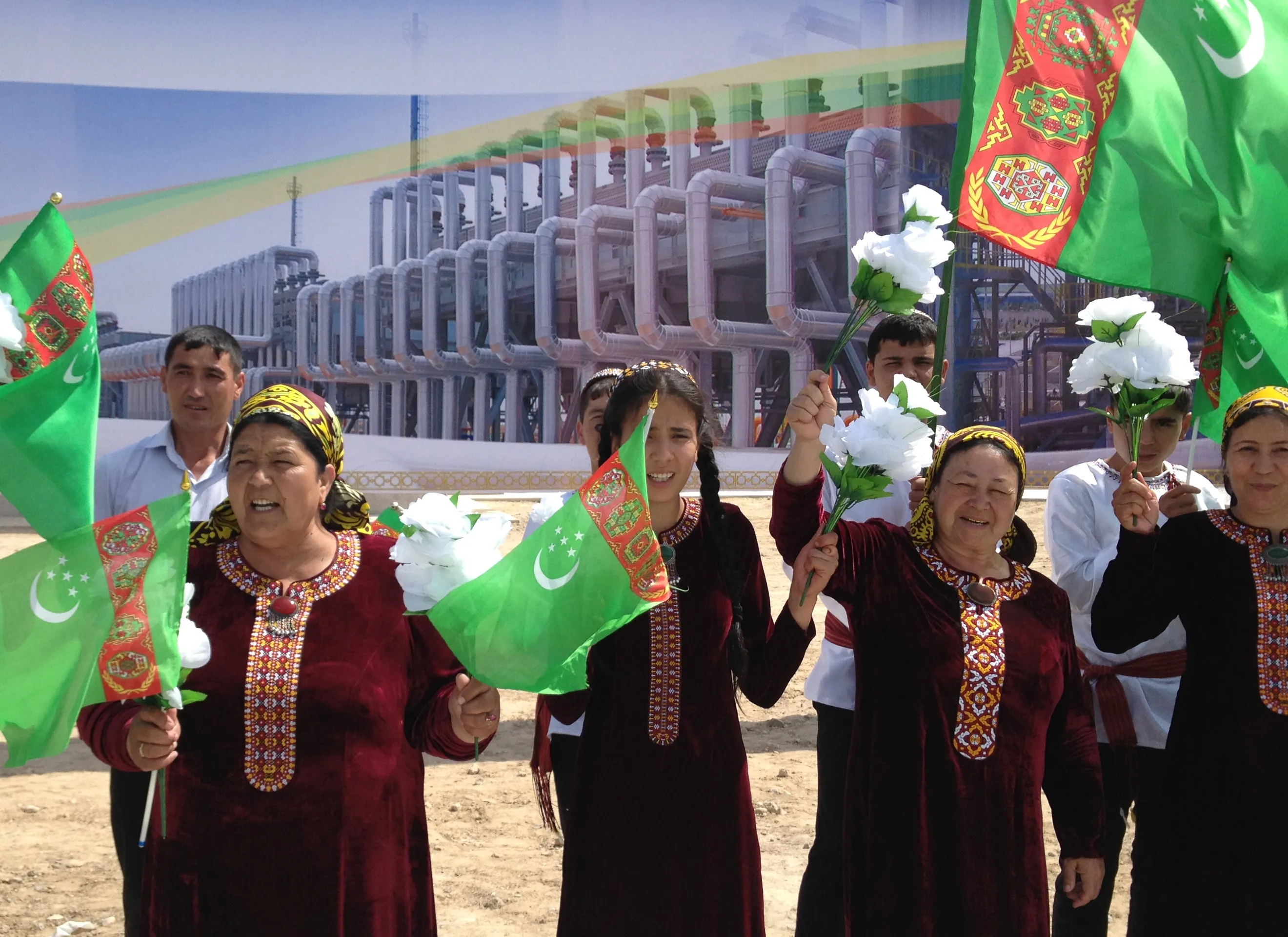 People wearing traditional dresses wave national flags in front of a poster as they attend an opening ceremony of a new gas processing plant at Bagtyarlyk gas field in eastern Turkmenistan May 7, 2014. (Photo by Marat Gurt/Reuters)