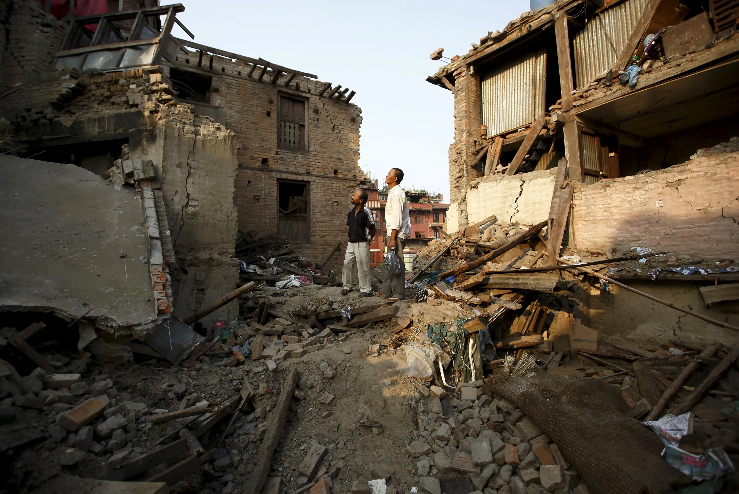 Men looks towards their collapsed house, a month after the April 25 earthquake in Kathmandu, Nepal May 25, 2015. (Photo by Navesh Chitrakar/Reuters)