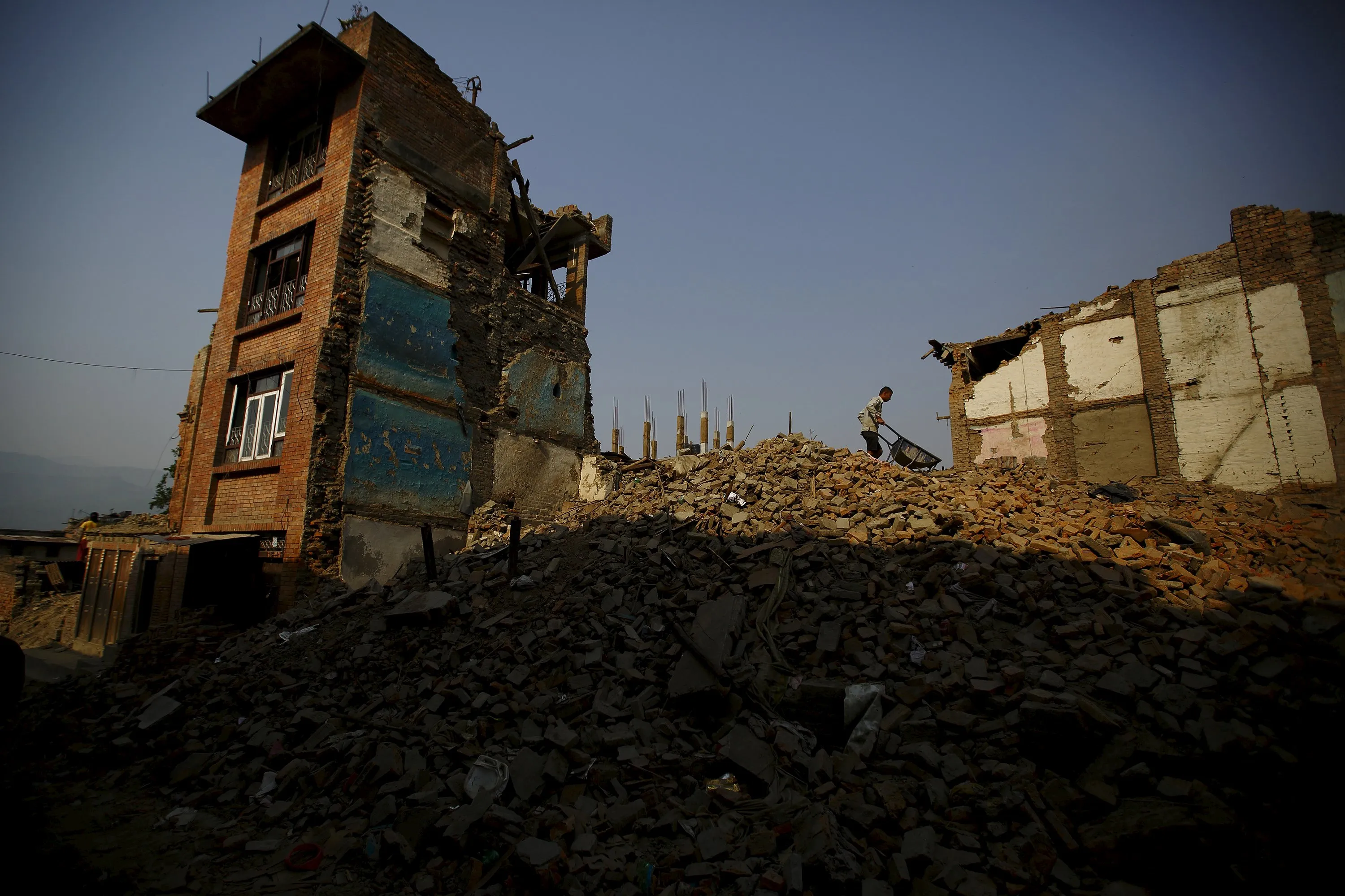 A man pushes cart filled with bricks, as he removes debris from collapsed houses, a month after the April 25 earthquake in Kathmandu, Nepal May 25, 2015. (Photo by Navesh Chitrakar/Reuters)