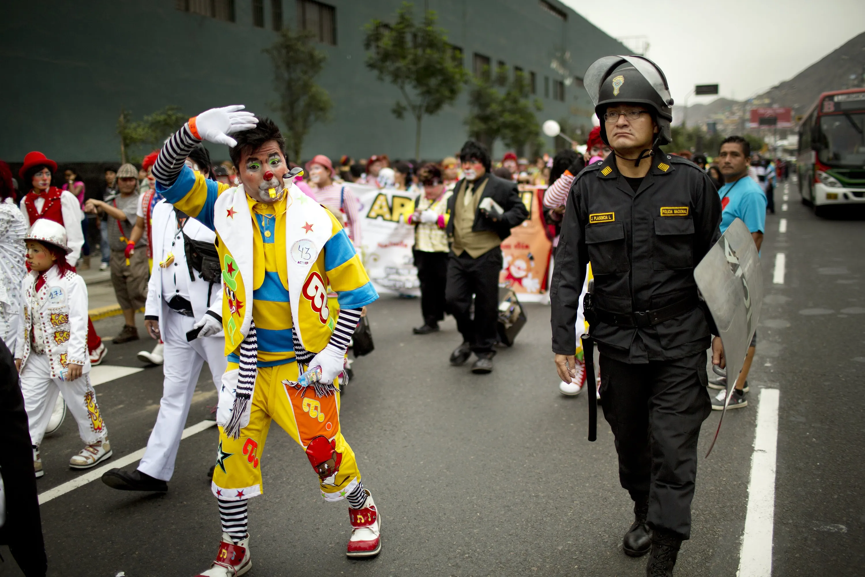 A clown greets photographers during a march commemorating the Peruvian clown day in Lima Peru, Monday, May 25, 2015. (Photo by Rodrigo Abd/AP Photo)