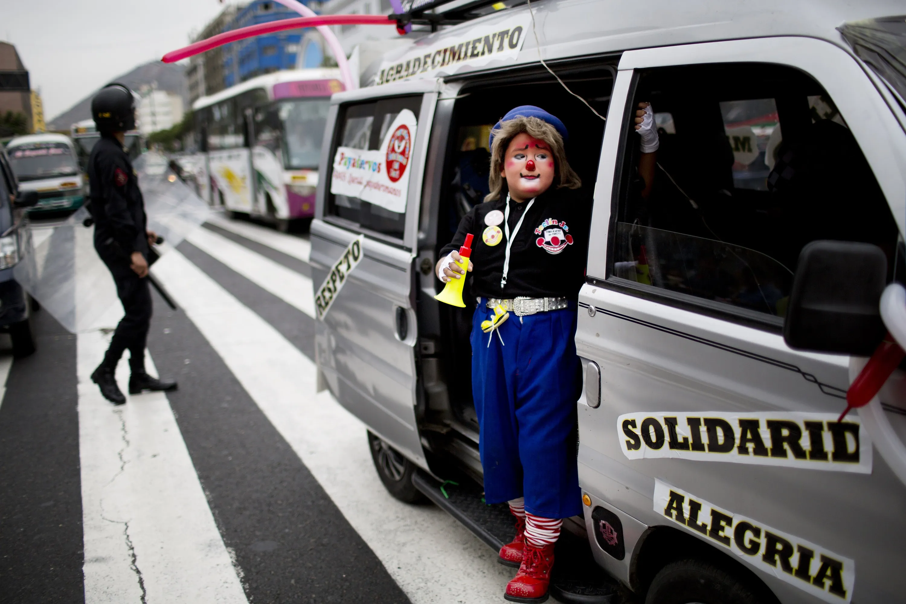 A clown standing on the doorway of a van accompanies the Peruvian Clown Day march in Lima Peru, Monday, May 25, 2015. (Photo by Rodrigo Abd/AP Photo)