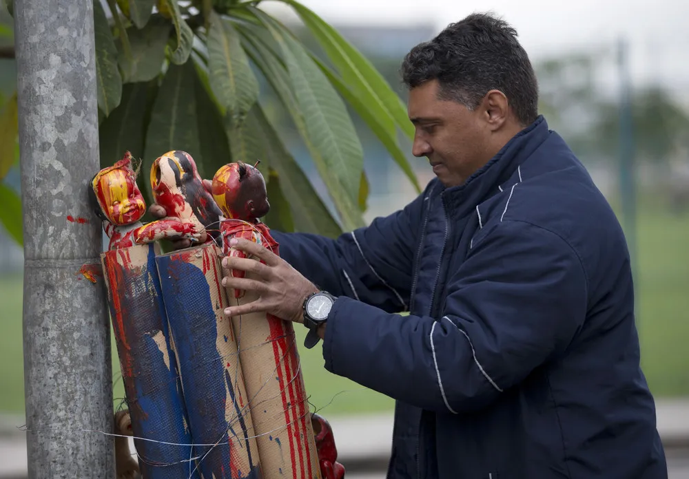 Brazilian artist Fabio Drumond arranges a sculpture made of trash collected from the coastline, as part of the exhibit titled "The Sea Isn't Made for Fish" at the Rio de Janeiro Federal University in Rio de Janeiro, Brazil, Monday, June 1, 2015. With poor trash and sewage services, Rio's waterways are choked with raw sewage and garbage. Organizers say the materials used in the sculptures were plucked off a nearby coast. (AP Photo/Silvia Izquierdo)