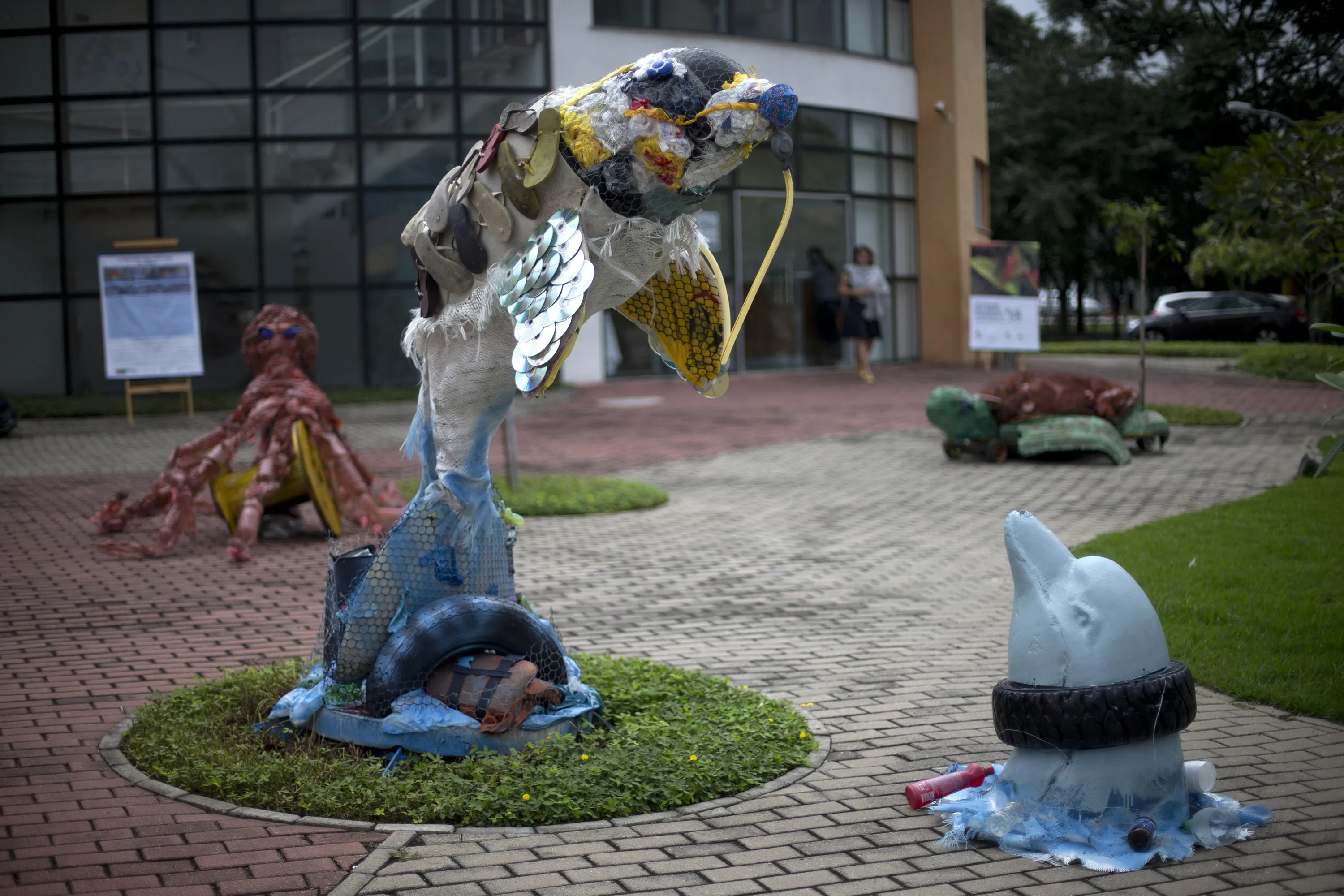 Sculptures of dolphins made with trash are exhibited at the Rio de Janeiro Federal University in Rio de Janeiro, Brazil, Monday, June 1, 2015. Art students have taken advantage of a material they have in endless supply _ trash _ to create an exhibition that aims to draw attention to the fetid state of the city's Guanabara Bay, where the Olympic sailing events are to be held next year. (AP Photo/Silvia Izquierdo)