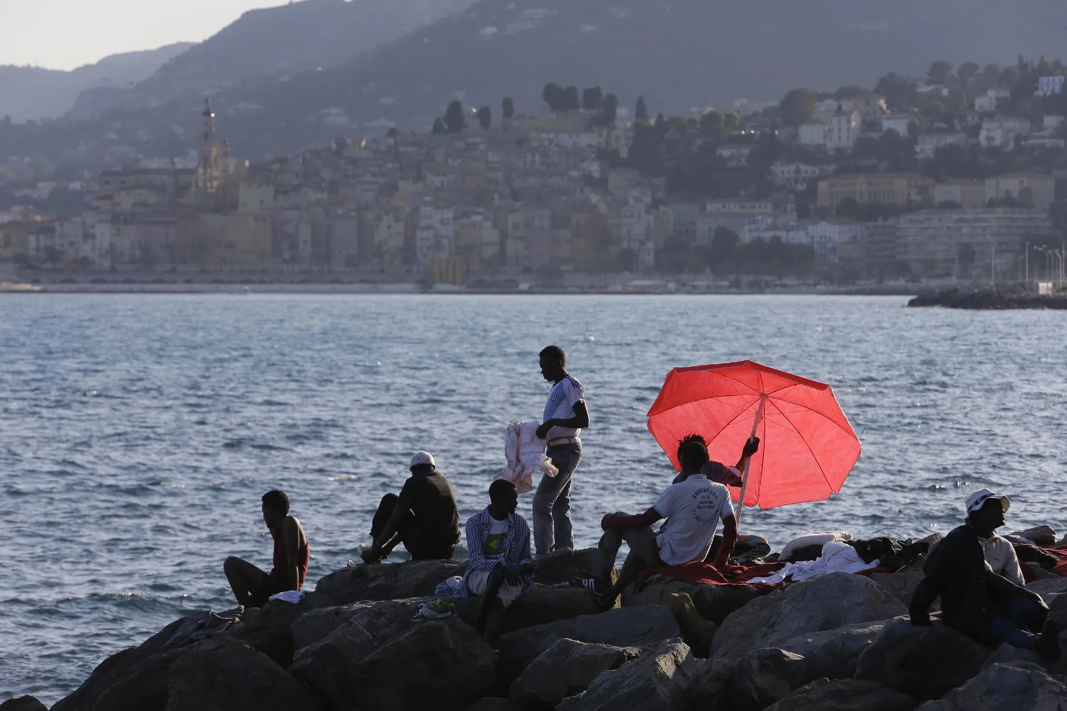 Migrants sit on the rocky beach at the Franco-Italian border in Ventimiglia, Italy, Wednesday, June 17, 2015. European Union nations failed to bridge differences Tuesday over an emergency plan to share the burden of the thousands of refugees crossing the Mediterranean Sea, while on the French-Italian border, police in riot gear forcibly removed dozens of migrants. (AP Photo/Lionel Cironneau)