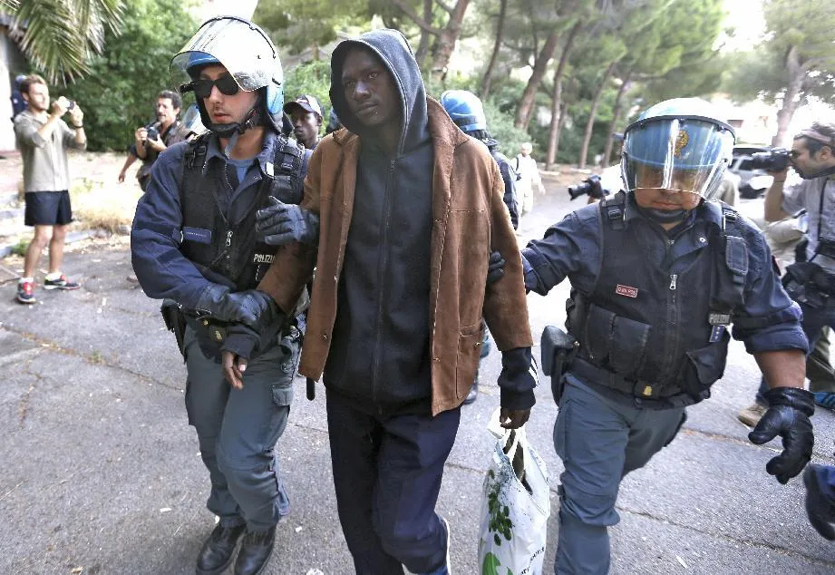 A migrant is evacuated by Italian police at the Franco-Italian border near Menton, southeastern France, Tuesday, June 16, 2015. Some 150 migrants, principally from Eritrea and Sudan, have been trying since last Friday to cross the border from Italy but have been blocked by French and Italian police. (AP Photo/Lionel Cironneau)