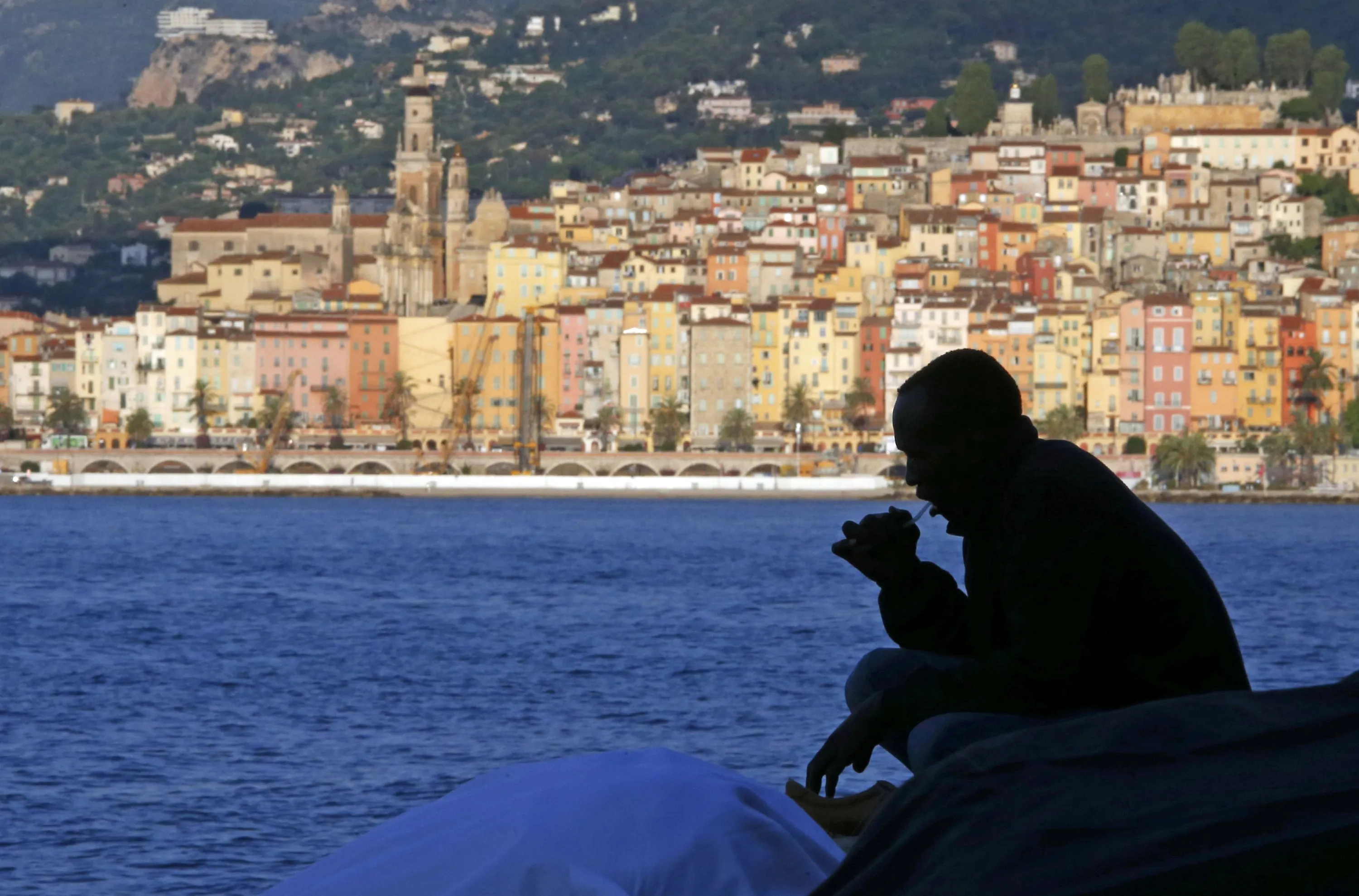 A migrant is silhouetted as he brushes his teeth on the rocks of the seawall at the Saint Ludovic border crossing on the Mediterranean Sea between Vintimille, Italy and Menton, France, June 17, 2015. Police on Tuesday began hauling away mostly African migrants from makeshift camps on the Italy-France border as European Union ministers met in Luxembourg to hash out plans to deal with the immigration crisis. The French city of menton is seen in the background. REUTERS/Eric Gaillard