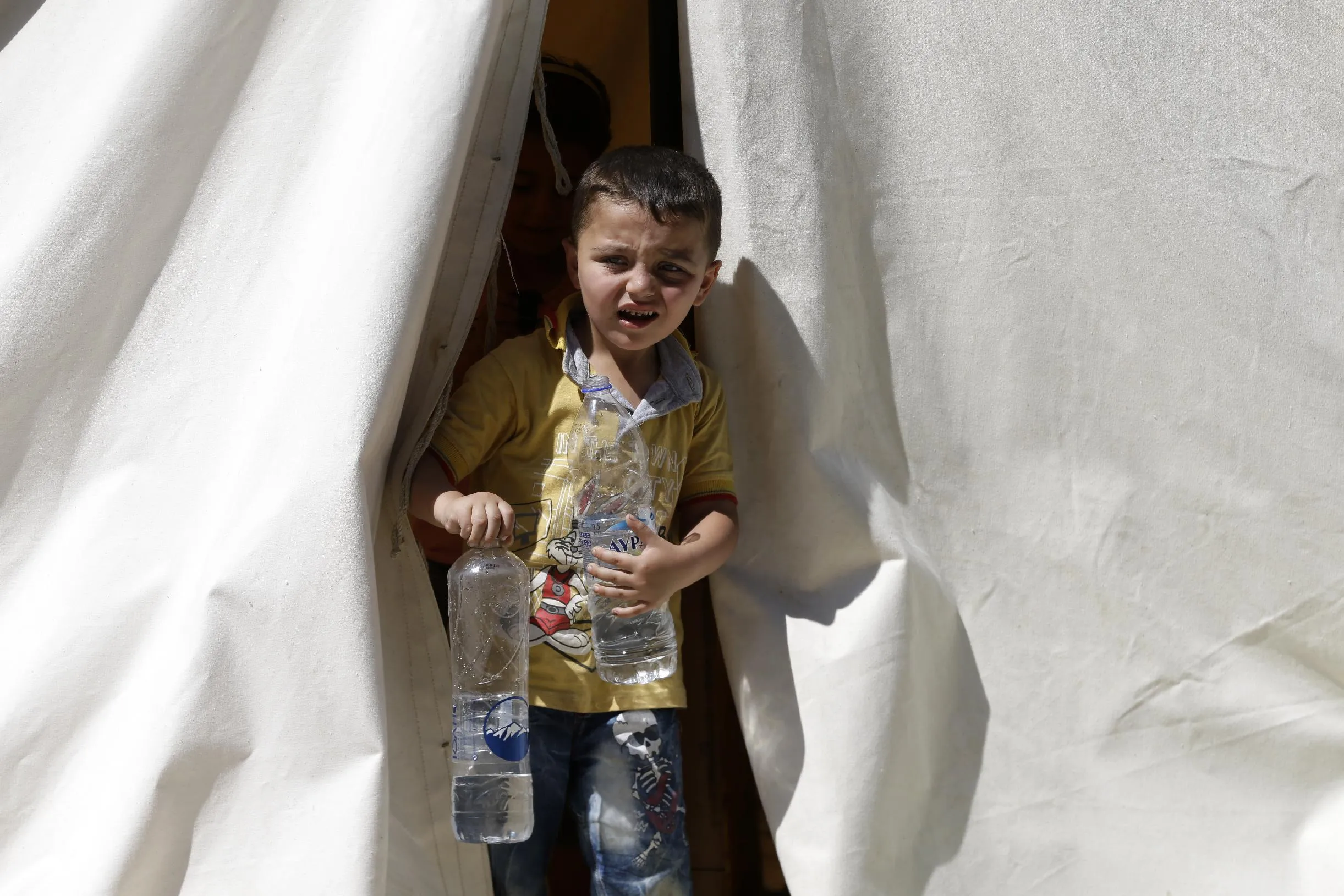 A boy holds two bottles of water as he leaves a tent at a refugee and migrant camp in the village of Moria on the northeastern Greek island of Lesvos on Wednesday, June 17, 2015. The Aegean island has borne the brunt of a huge influx of migrants from the Middle East, Asia and Africa crossing from Turkey to nearby Greek islands. More than 50,000 migrants have arrived in Greece so far this year. (AP Photo/Thanassis Stavrakis)