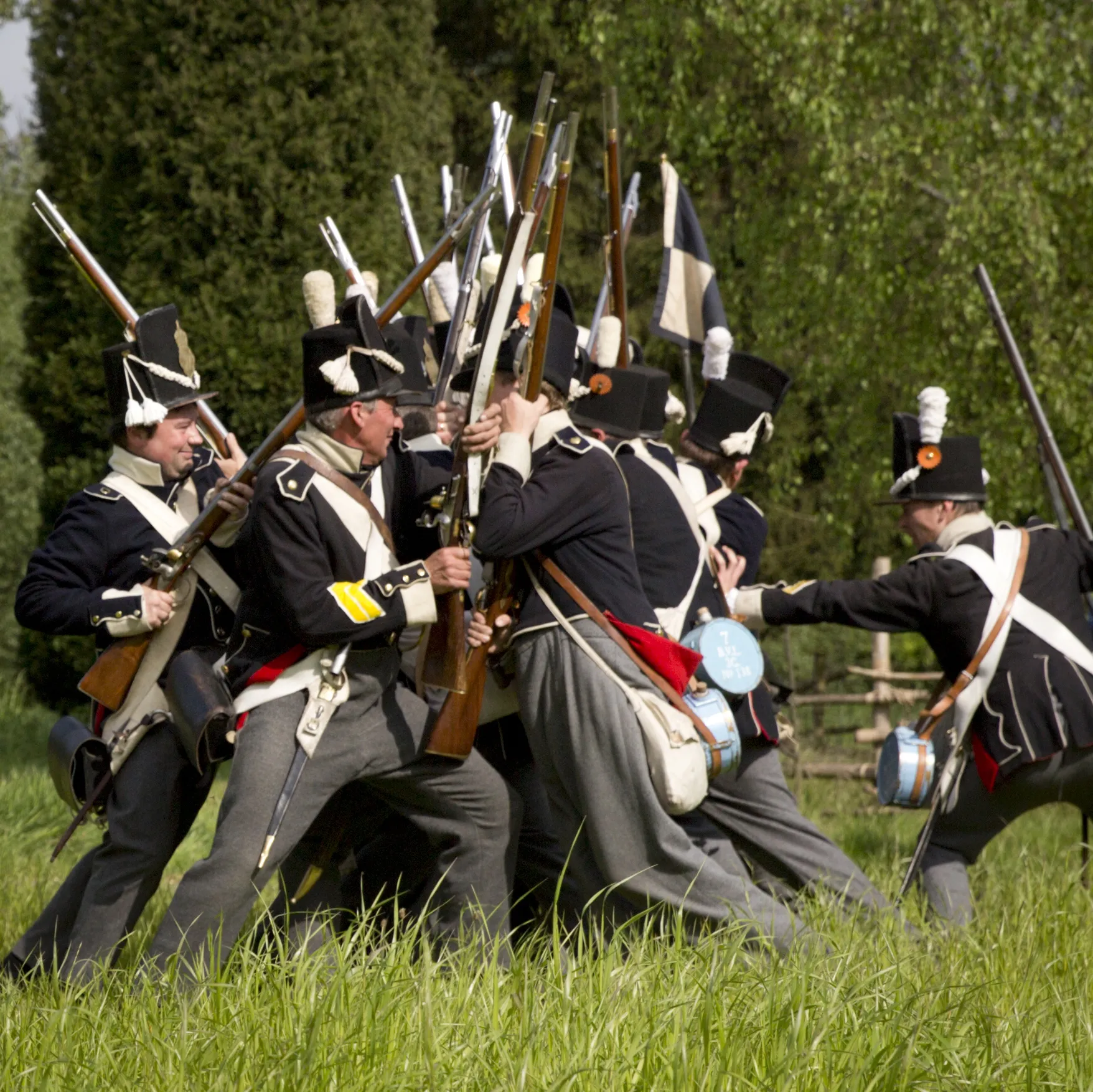 In this May 10, 2015, photo, historical re-enactors dressed as soldiers of the Belgian-Dutch 7th Battalion of the Line fire their weapons during a drill at a Napoleonic era living history camp in Elewijt, Belgium. The Belgian-Dutch living history group is coordinating their group for participation in the 200th anniversary of the Battle of Waterloo which will take place in June 2015. (AP Photo/Virginia Mayo)