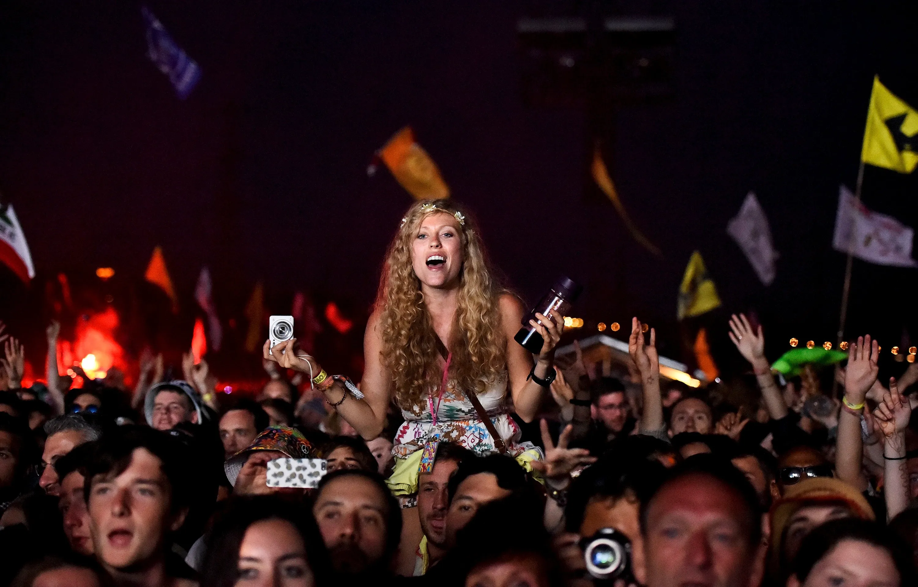Revellers dance as they listen to Florence and the Machine perform on the Pyramid Stage at Worthy Farm in Somerset during the Glastonbury Festival in Britain, June 26, 2015. (Photo by Dylan Martinez/Reuters)
