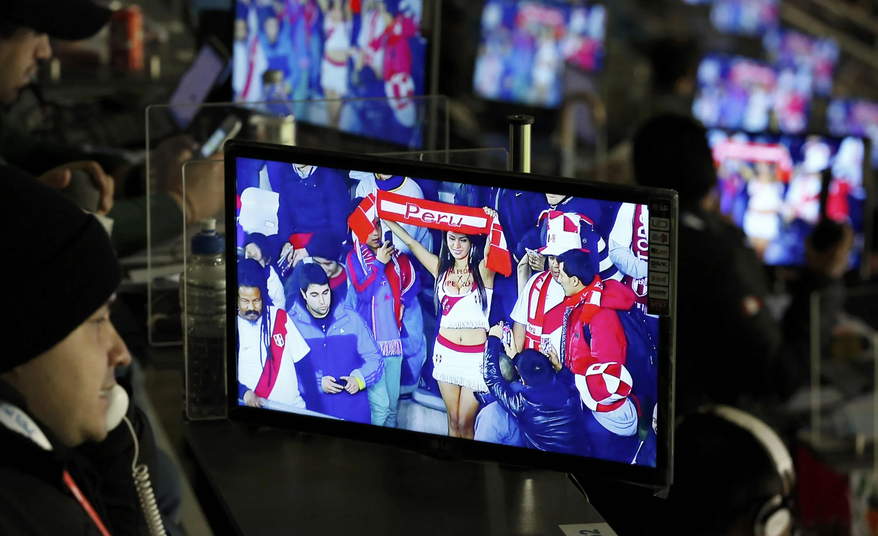 A journalist watches a monitor showing Peru fans as he talks on the phone at the press tribune ahead of the Copa America 2015 quarter-finals soccer match between Bolivia and Peru at Estadio Municipal Bicentenario German Becker in Temuco, Chile, June 25, 2015. (Photo by Carlos Garcia Rawlins/Reuters)
