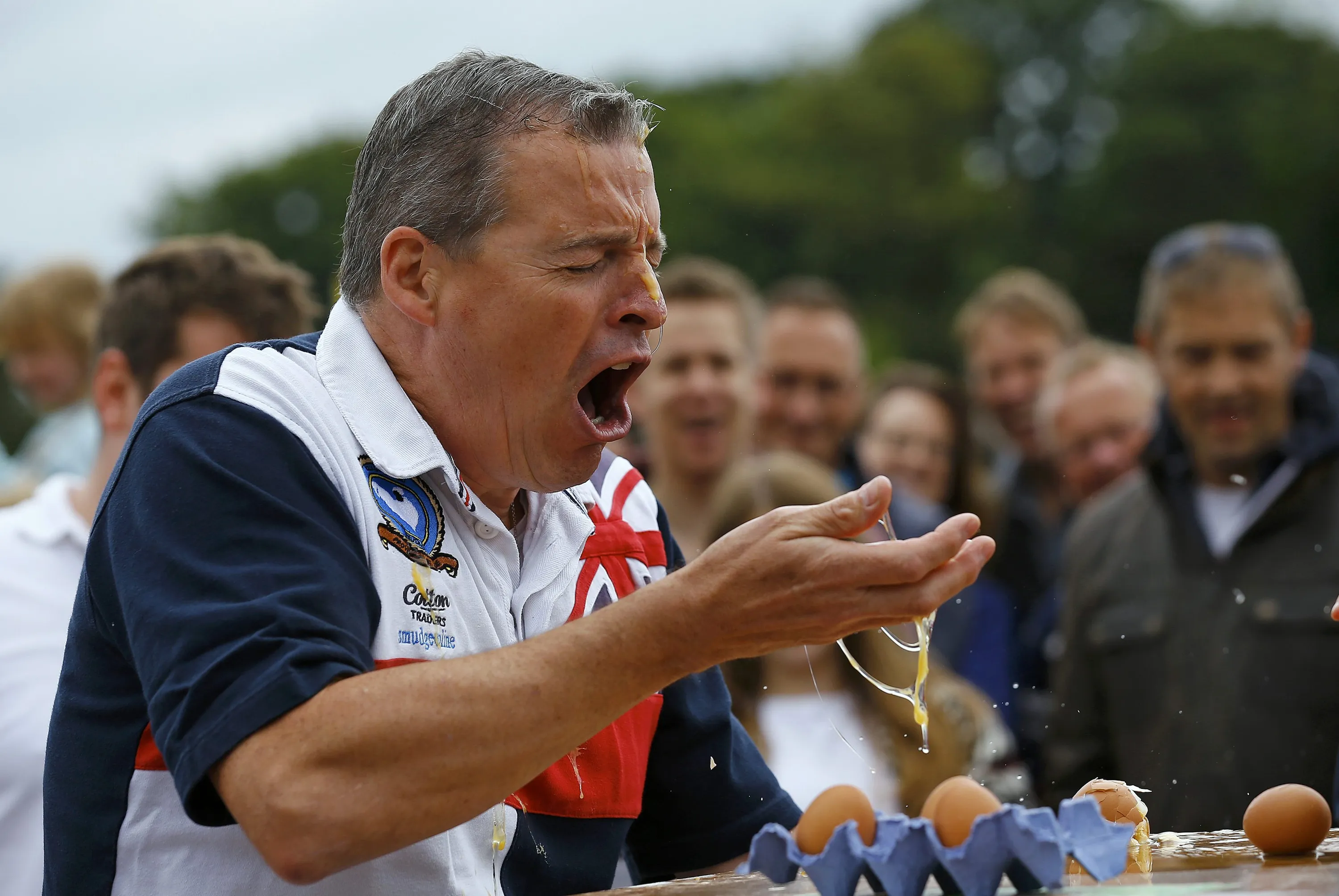 A man reacts after losing a game of Russian Egg Roulette during the World Egg Throwing Championships and Vintage Day in Swaton, Britain June 28, 2015. (Photo by Darren Staples/Reuters)