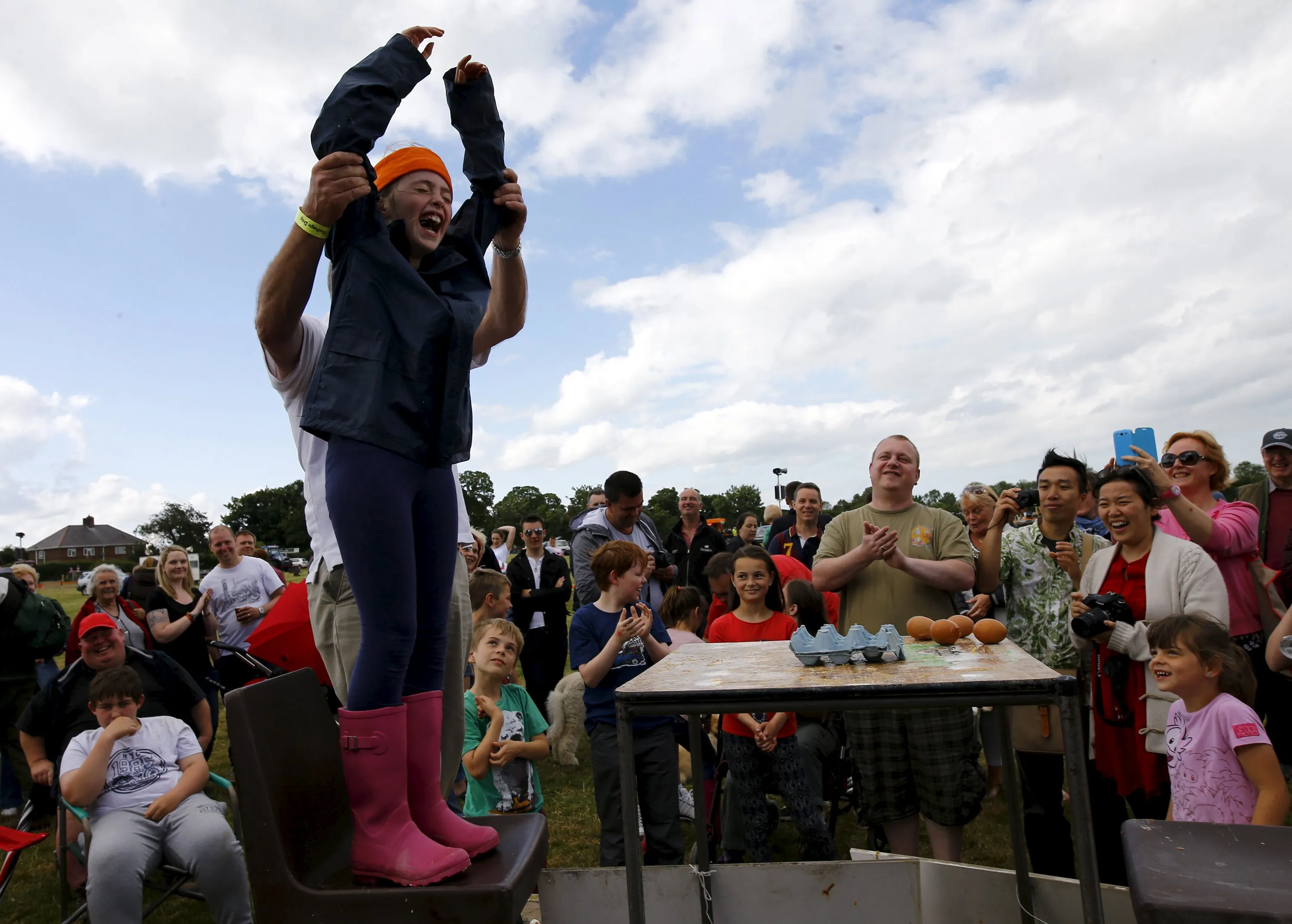 Anya Dawson, 8, celebrates after becoming the Russian Egg Roulette champion during the World Egg Throwing Championships and Vintage Day in Swaton, Britain June 28, 2015. (Photo by Darren Staples/Reuters)