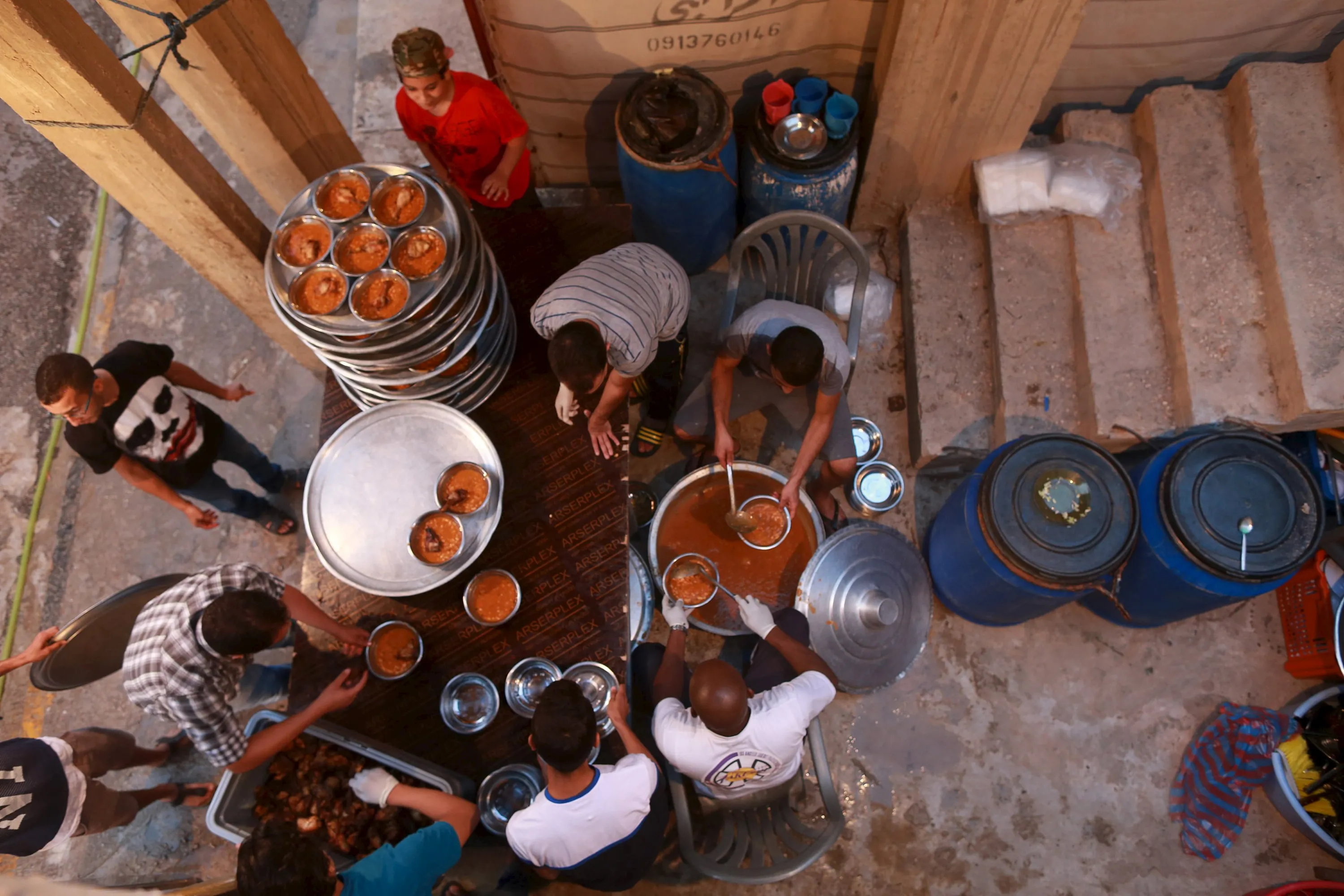 Volunteers prepare food as people wait to eat their Iftar (breaking of fast) meal at tables set up by a charity during the holy fasting month of Ramadan in Benghazi, Libya June 27, 2015. (Photo by Esam Omran Al-Fetori/Reuters)