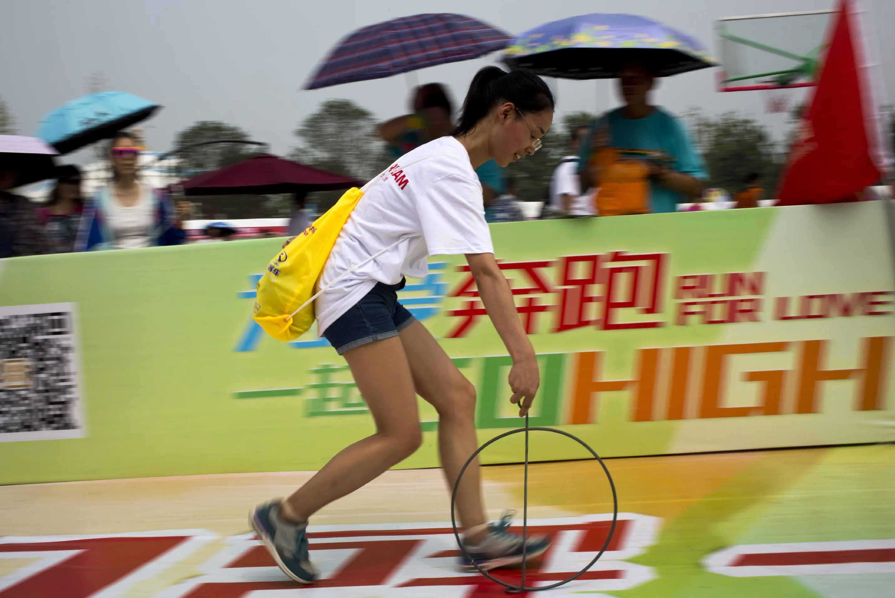 A woman plays rolling iron hoop during a public sport campaign to promote exercise organized by city government at Garden Expo Park in Beijing, China, Sunday, June 28, 2015. The campaign is to encourage people exercise to support Beijing's bid to host the 2022 Winter Olympics. (Photo by Andy Wong/AP Photo)