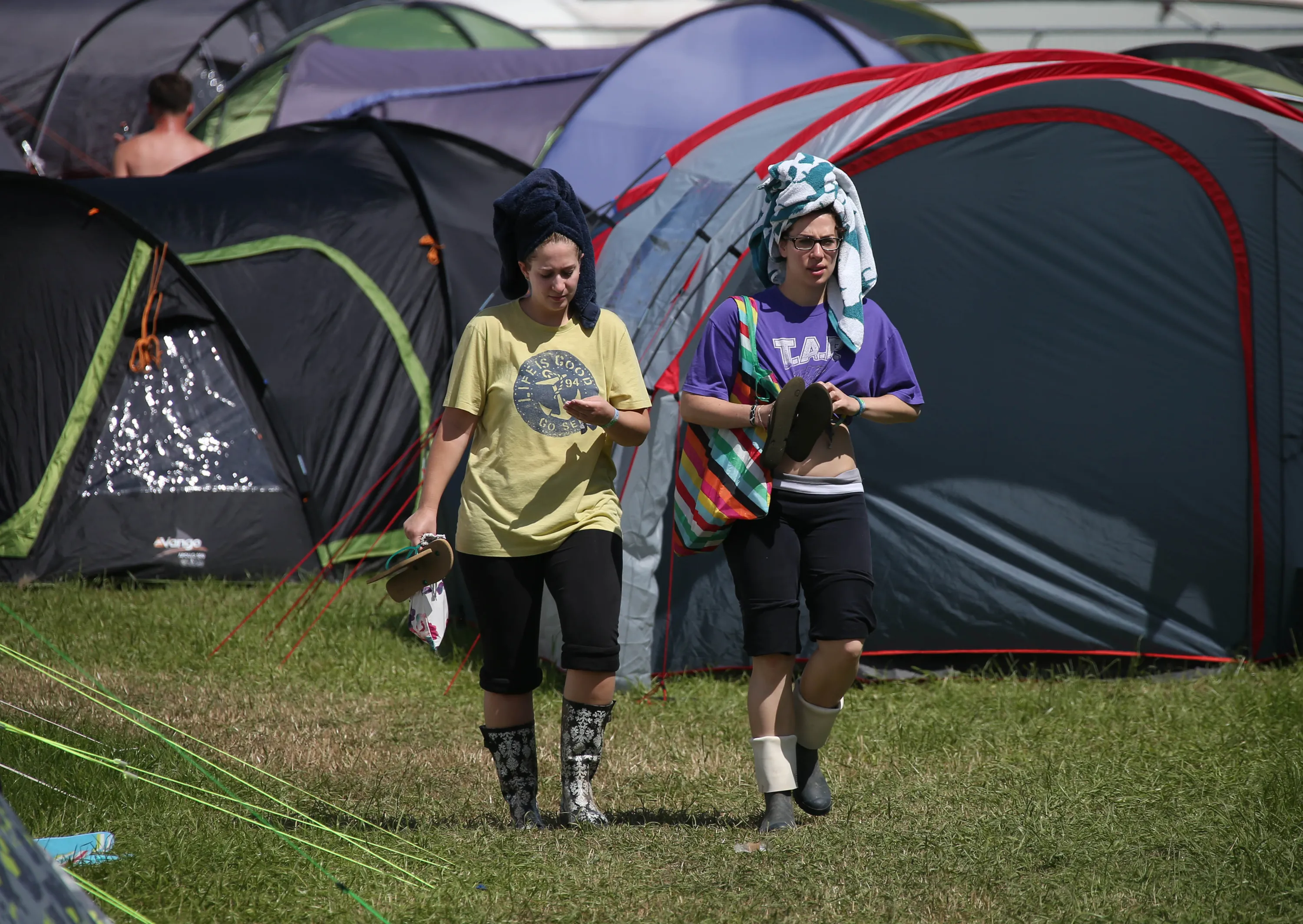 Festival goers walk back to the tent with towels on their heads during Glastonbury Music Festival on Saturday, June 27, 2015 at Worthy Farm, Glastonbury, England. (Photo by Joel Ryan/Invision/AP Photo)