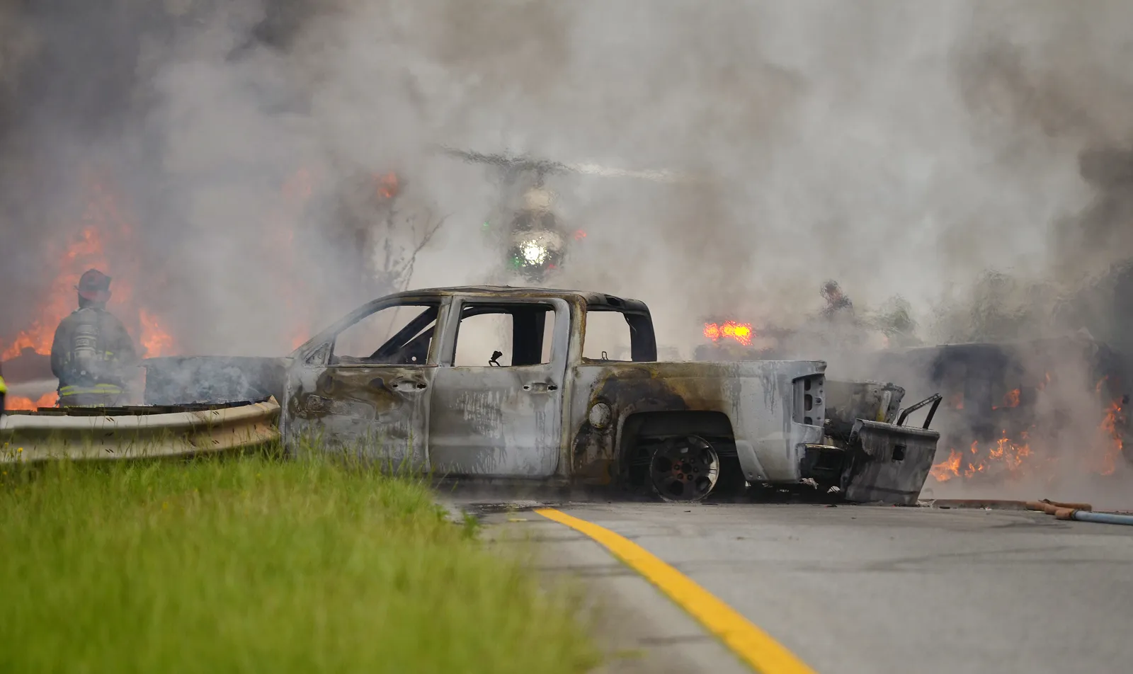 Firefighters with multiple departments battle a fire at a fatal accident involving a tanker in Spartanburg, S.C., Saturday, June 27, 2015. Officials say two people are dead following the fiery crash involving a tanker truck and at least one other vehicle on Interstate 26. S.C. Highway Patrol Lance Cpl. Bill Rhyne confirmed the two deaths in Saturday's crash. (Photo by Tim Kimzey/The Spartanburg Herald-Journal via AP Photo)