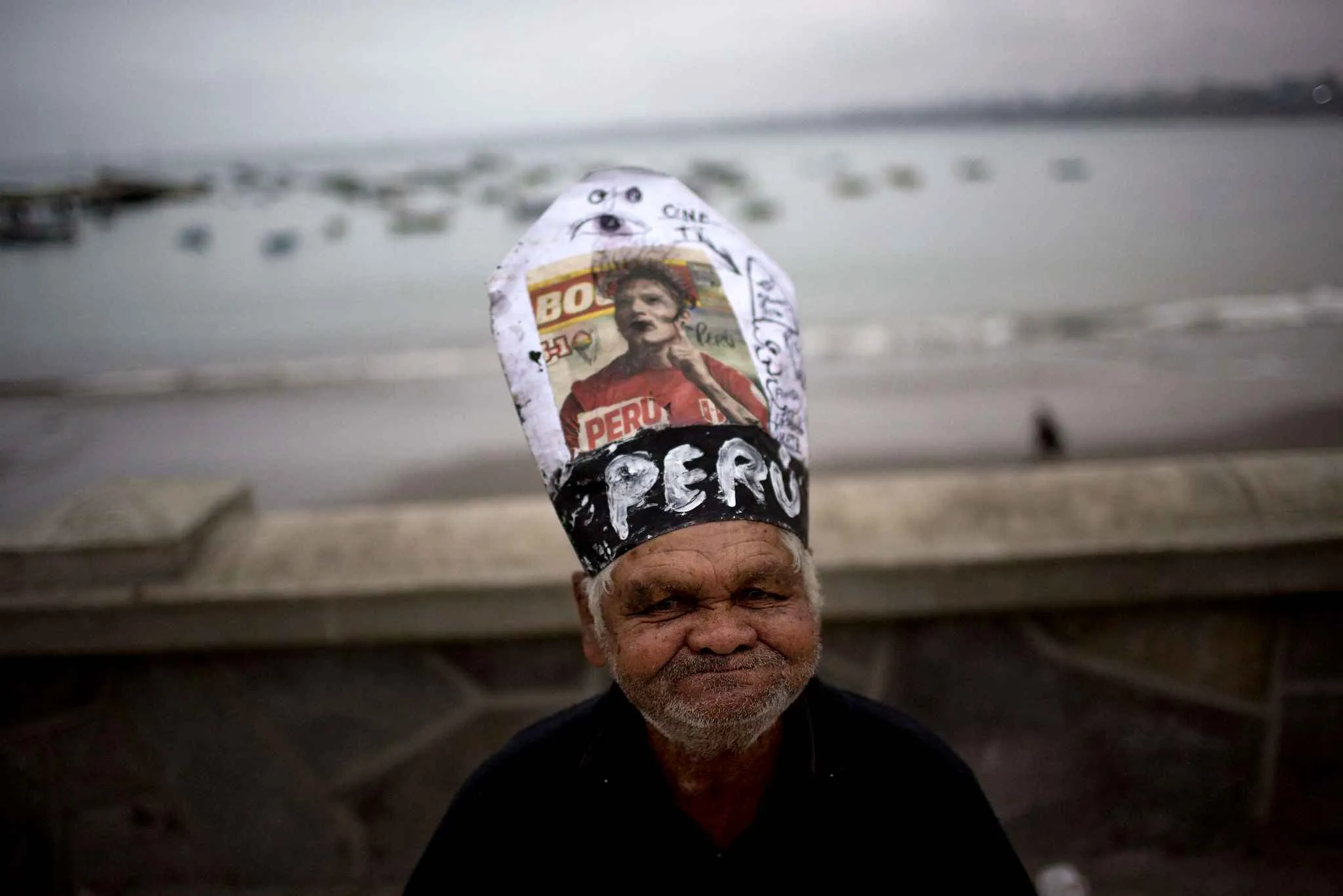 Carlos Humala poses for the picture wearing a makeshift hat resembling the Pope's, with a picture of soccer player Paolo Guerrero, during Saint Peter's day celebrations in Lima, Peru, Monday, June 29, 2015. During the feast day of the Catholic saint, who is the patron saint of fishermen, coastal communities pay homage to St. Peter, whose statue is paraded to the sea and petitions are made to keep their vessels and all who work on them safe. (Photo by Rodrigo Abd/AP Photo)