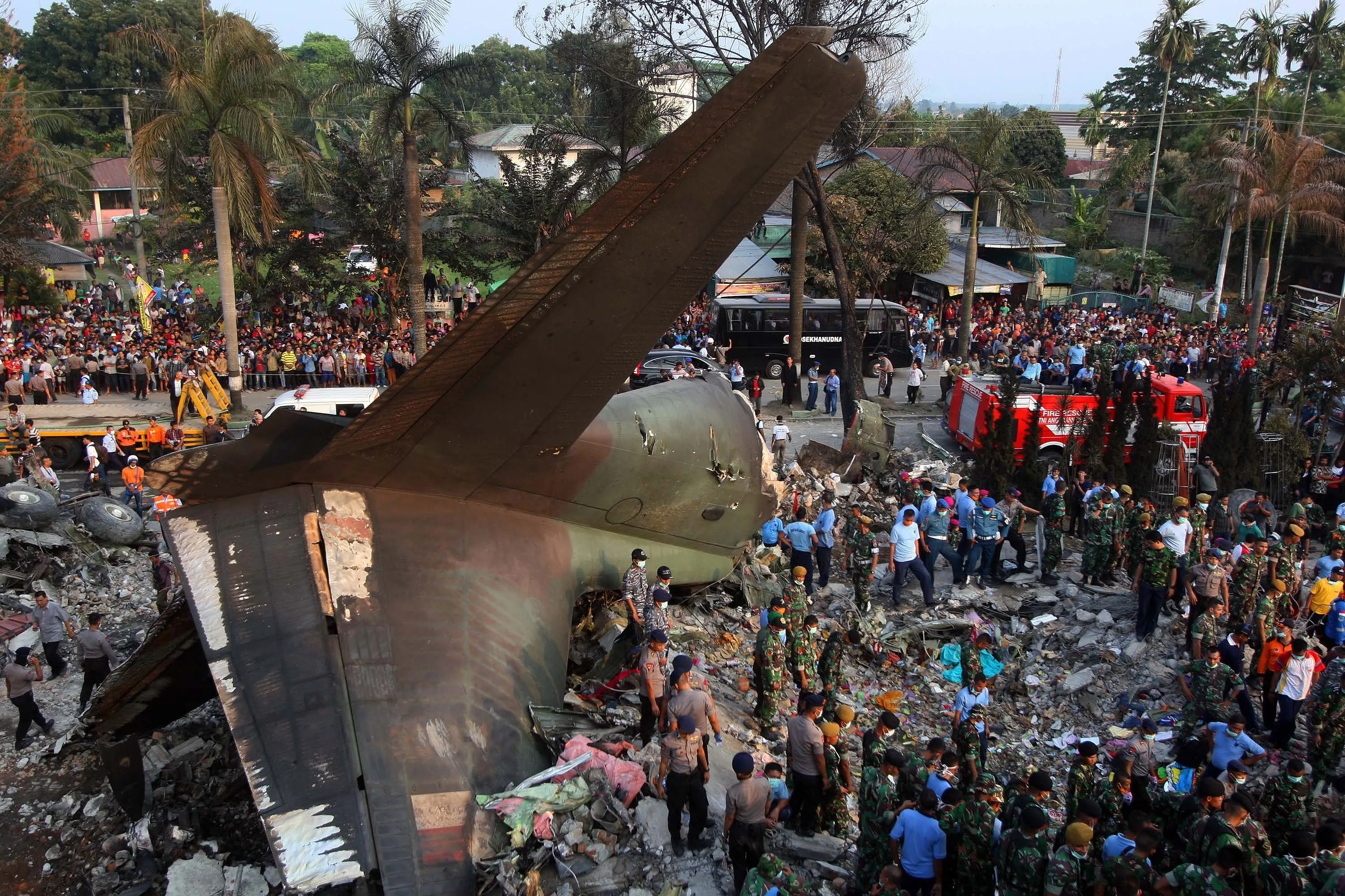 Indonesian rescuers search for victims of the crashed military airplane in Medan, North Sumatra, Indonesia, 30 June 2015. At least people 49 people were killed after an Indonesian military plane crashed in North Sumatra and burst into flames, officials said. Air Force chief Air Marshal Agus Supriatna said there were no survivors after the plane ploughed into houses and commercial buildings in Medan, the country's third largest city. The plane left Jakarta with 113 people aboard, including military personnel and their relatives, but it was not clear how many continued the journey to Medan after stopovers in Pekanbaru and Dumai, Agus said. (Photo by Dedi Sahputra/EPA)