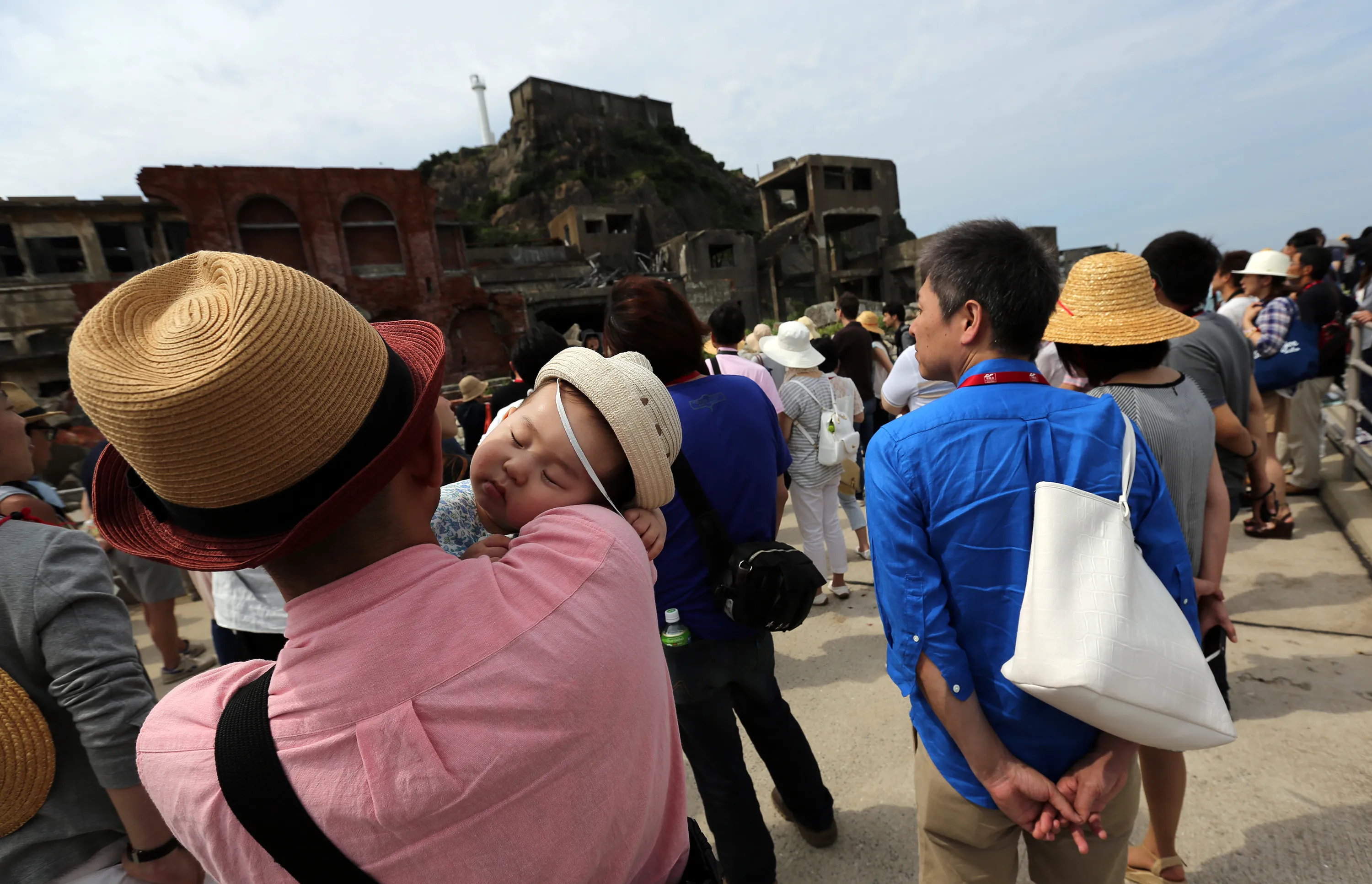 In this June 29, 2015 photo, tourists visit at Hashima Island, commonly known as Gunkanjima, which means “Battleship Island”, off Nagasaki, Nagasaki Prefecture, southern Japan. (Photo by Eugene Hoshiko/AP Photo)