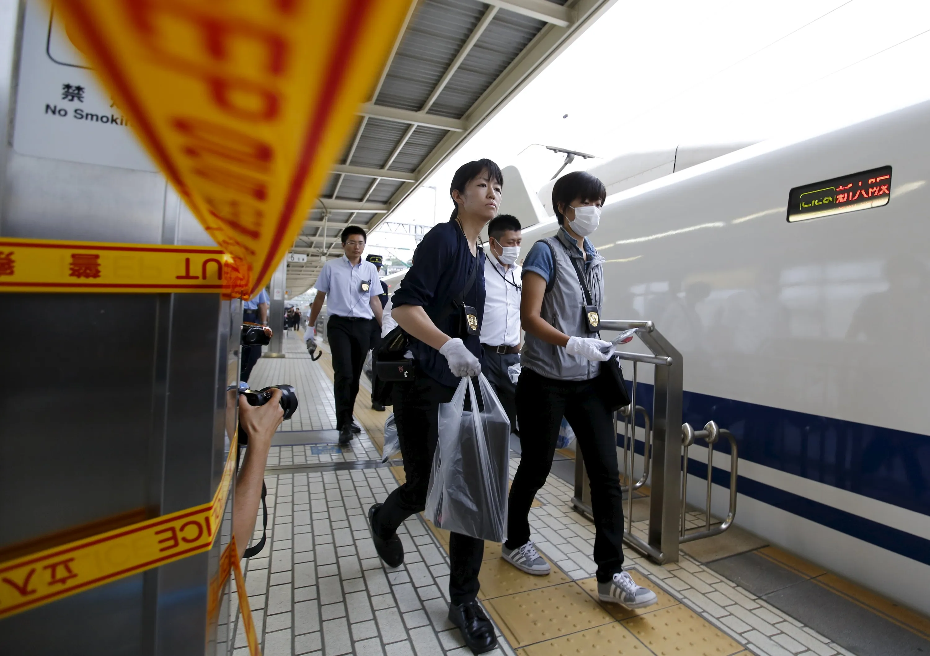 Police officers carry passengers' personal belongings as they collect these from a Shinkansen bullet train at Odawara station after it made an emergency stop, in Odawara, west of Tokyo June 30, 2015. (Photo by Toru Hanai/Reuters)