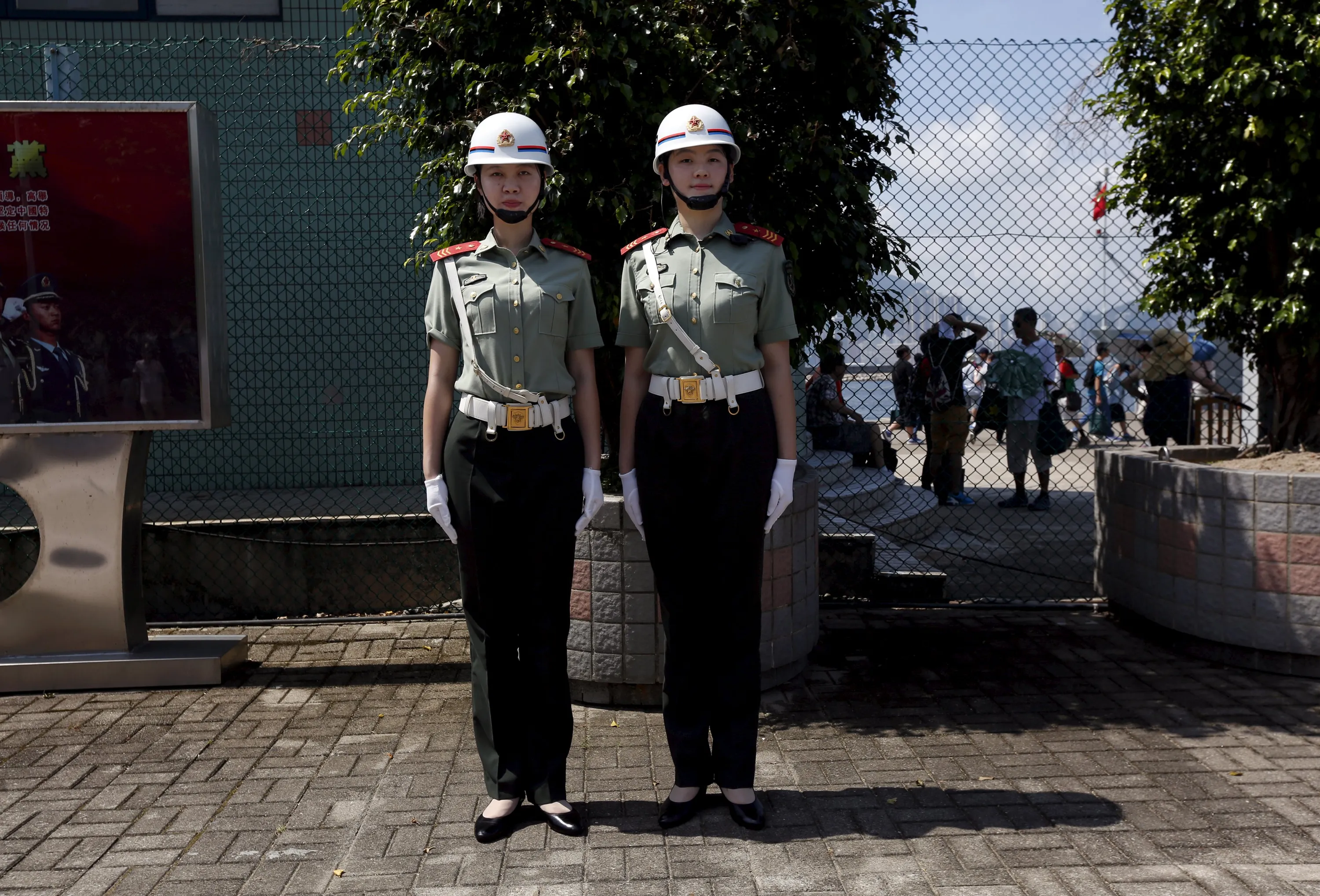 Two female People's Liberation Army (PLA) soldiers stand at attention at a PLA naval base in Hong Kong, China July 1, 2015. (Photo by Bobby Yip/Reuters)