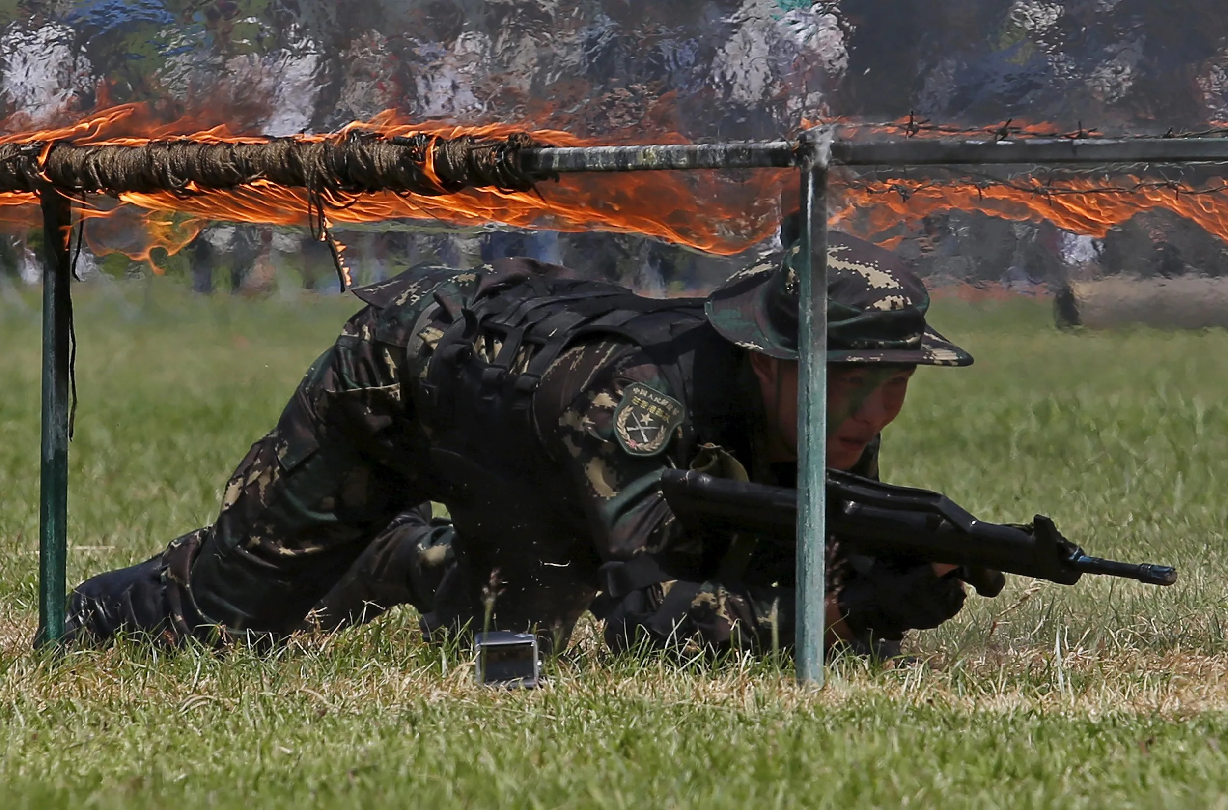 A People's Liberation Army (PLA) soldier crawls underneath fire during an anti-terrorist drill, at a PLA naval base in Hong Kong, China July 1, 2015. (Photo by Bobby Yip/Reuters)
