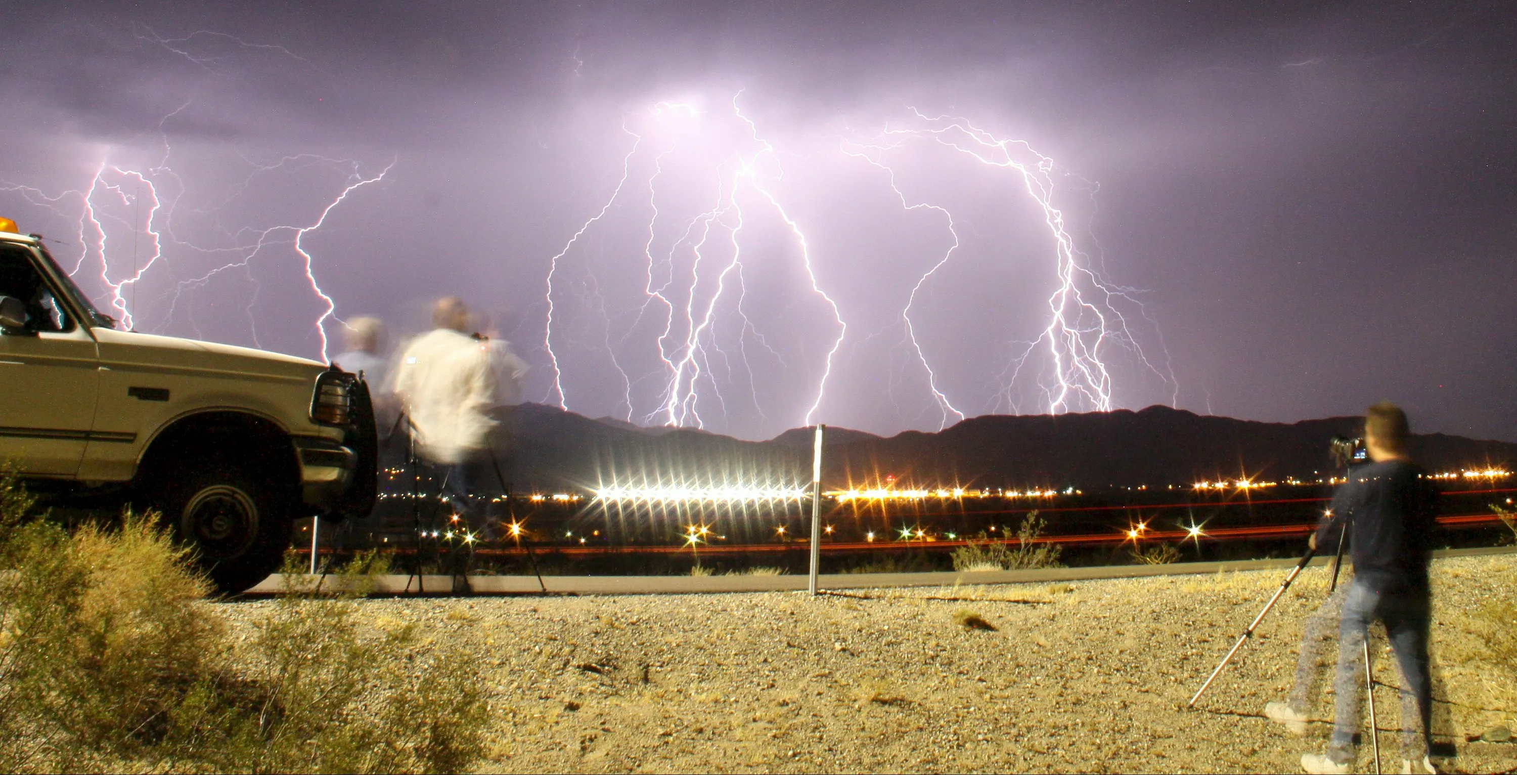 Southern California storm chasing photographers take pictures of the mass lightning bolts lighting up night skies from monsoon storms passing over the high deserts, early Wednesday north of Barstow, California, July 1, 2015. Picture taken using long exposure. (Photo by Gene Blevins/Reuters)