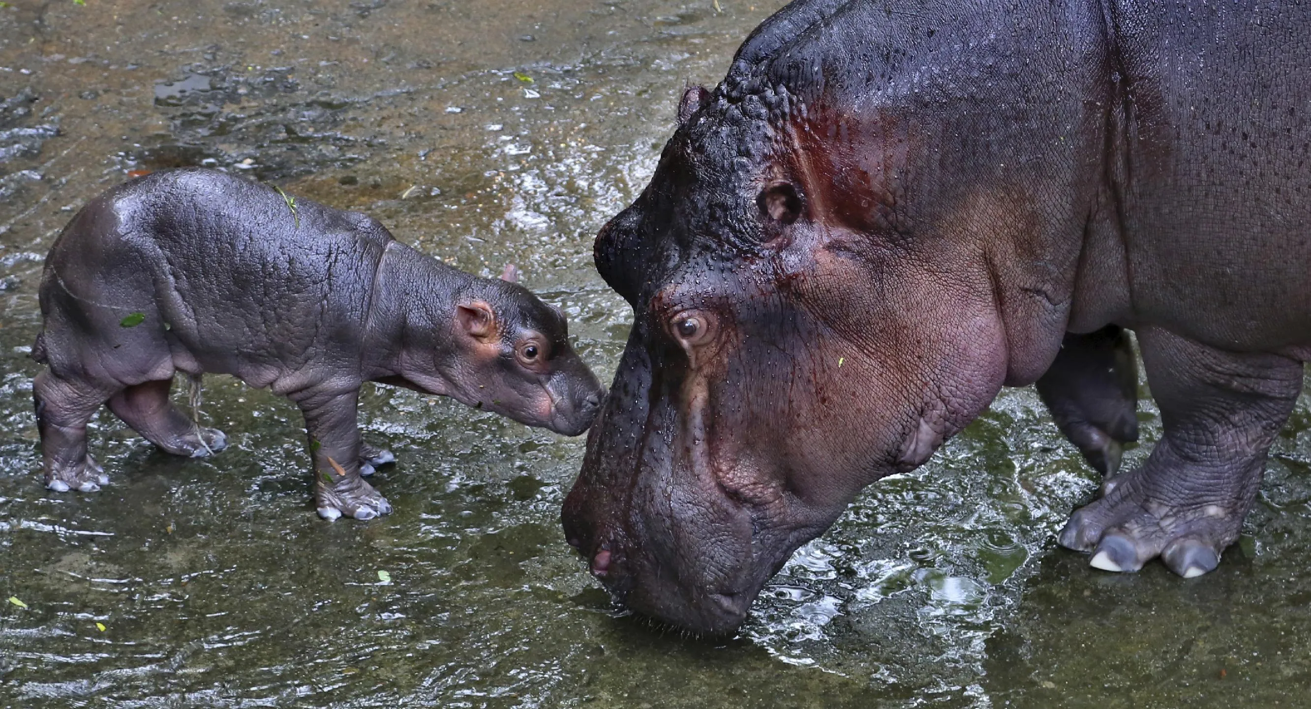 Kaveri, eight-year-old hippopotamus, right, plays with her yet to be named three-day-old baby hippo inside their enclosure at the Bannerghatta National Park, 25 kilometers (16 miles) south of Bangalore, India, Wednesday, July 1, 2015. (Photo by Aijaz Rahi/AP Photo)