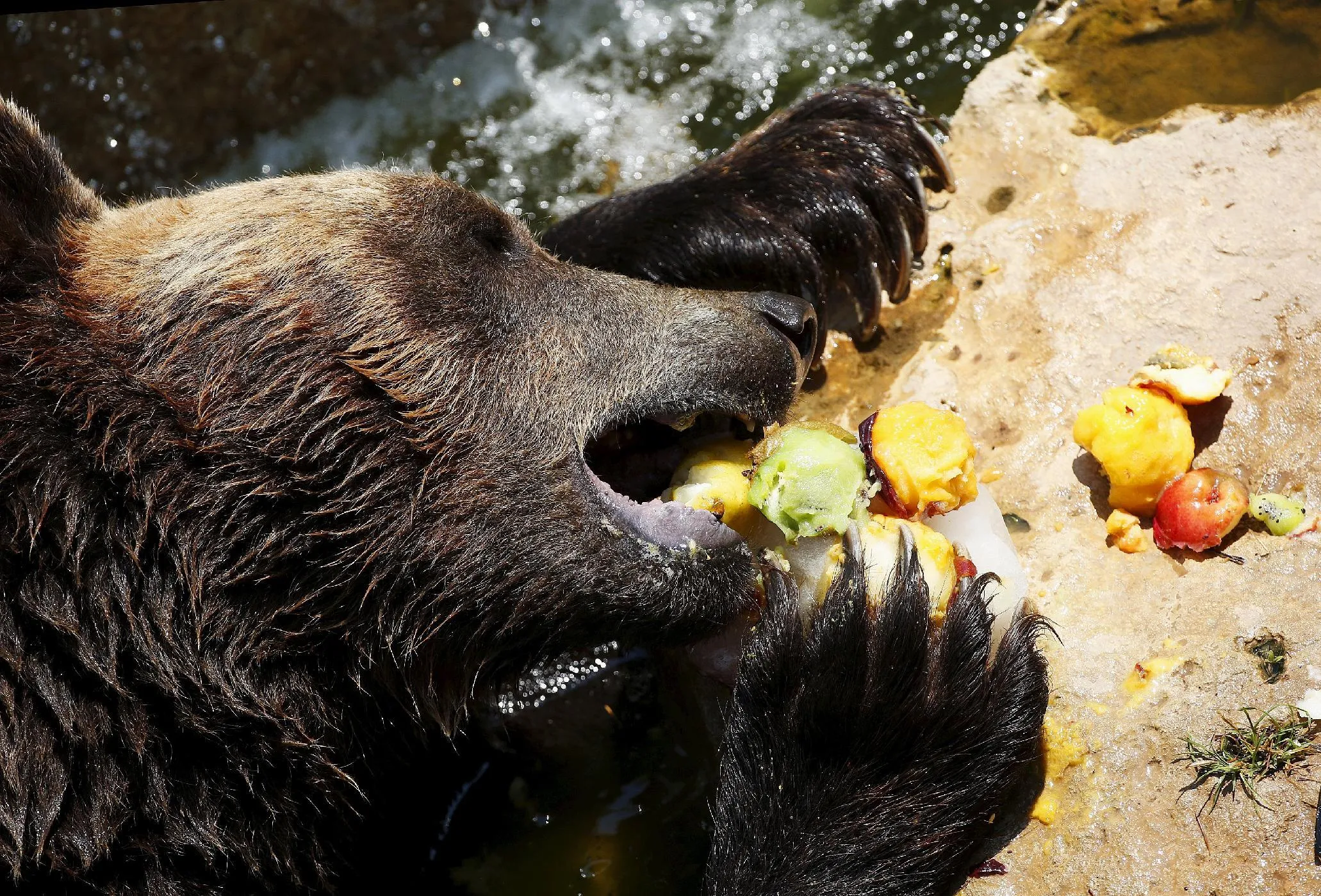 A brown bear eats fruits during a hot day at Biopark Zoo in Rome, Italy, July 2, 2015. (Photo by Alessandro Bianchi/Reuters)