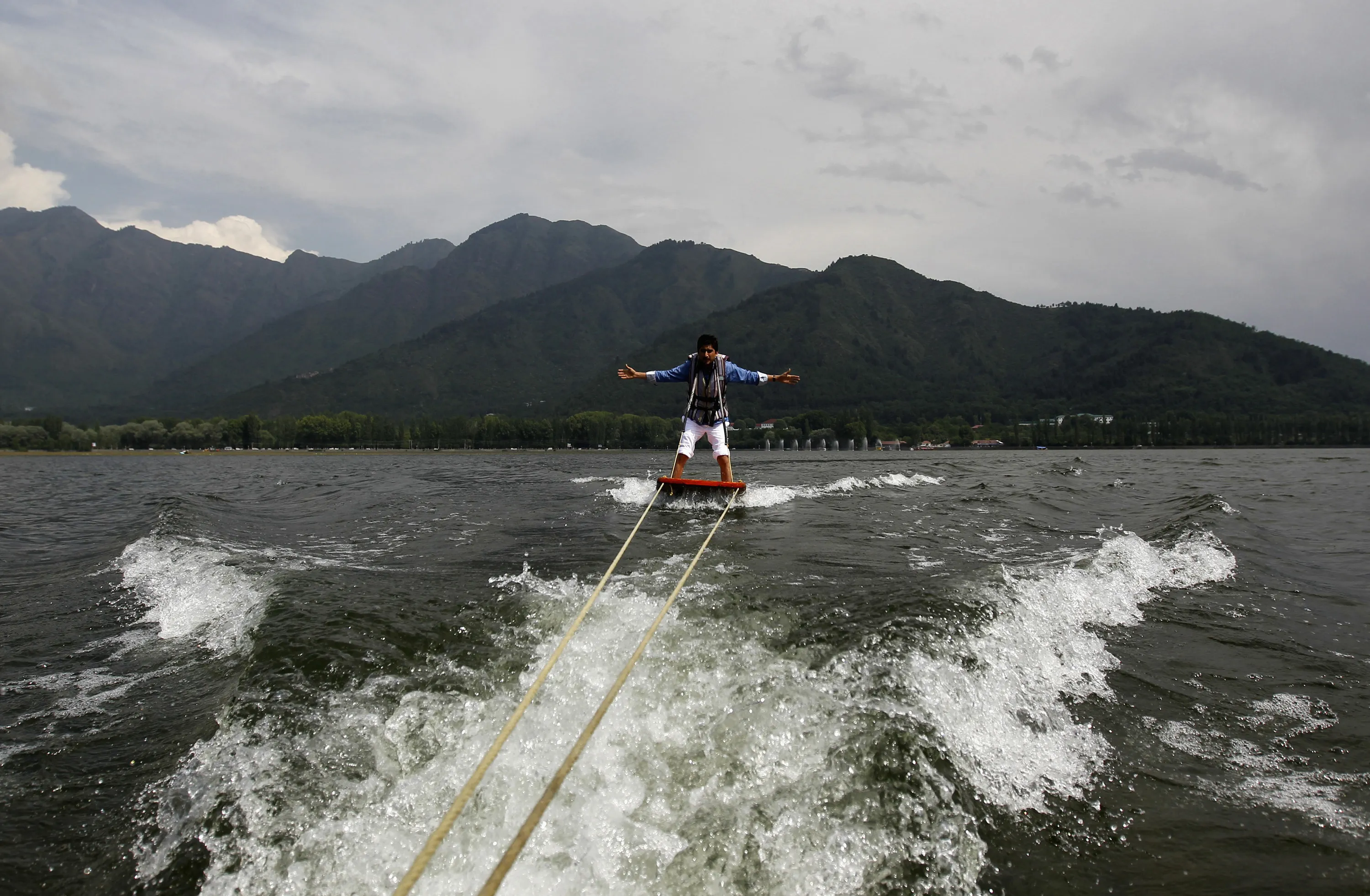 An Indian tourist enjoys water skiing on the waters of Dal Lake in Srinagar June 10, 2012. (Photo by Fayaz Kabli/Reuters)