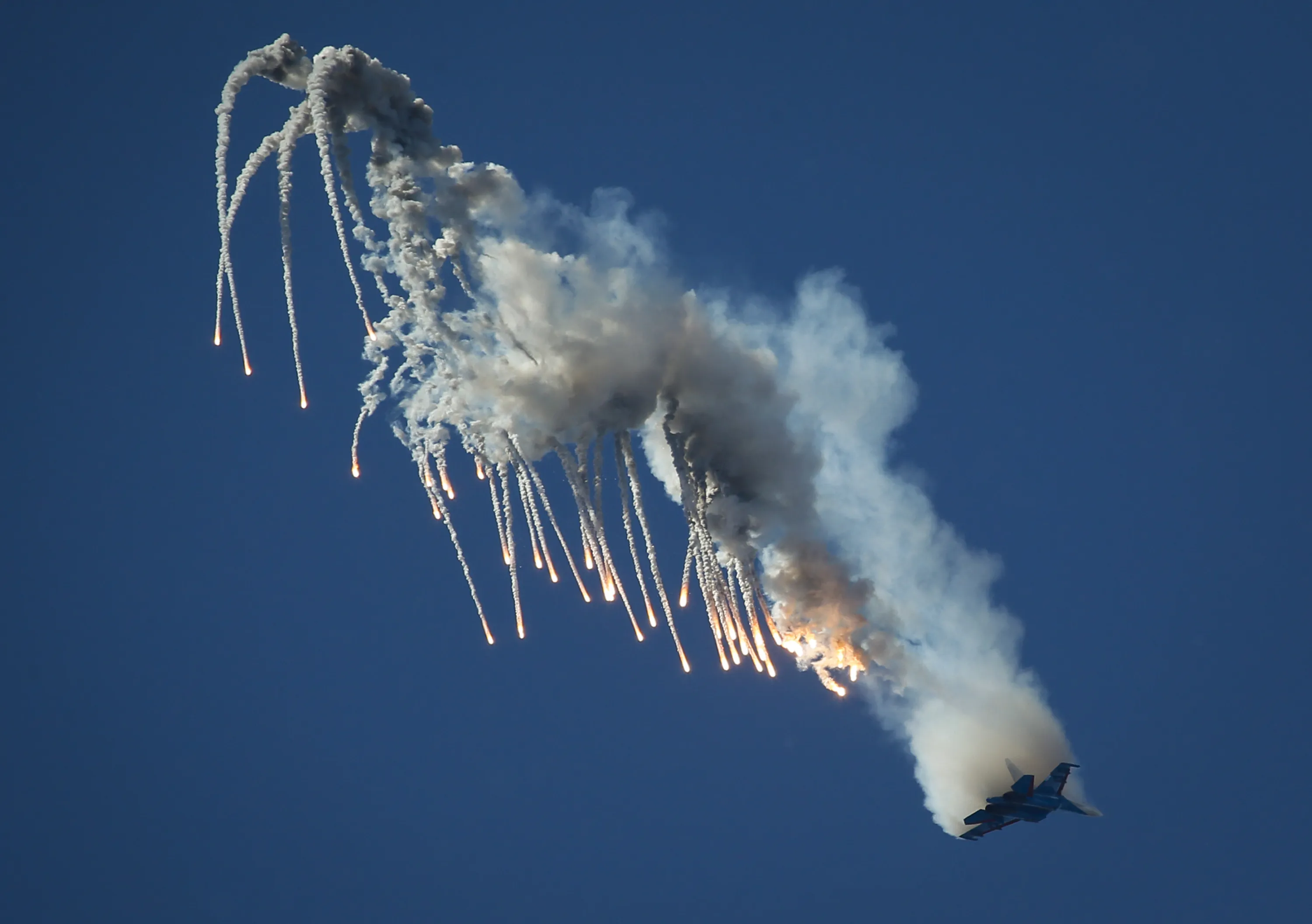 A Su-27 jet of aerobatics team Russkiye Vityasy, or Russian Knights performs during the International Maritime Defence show in St.Petersburg, Russia, Thursday, July 2, 2015. (Photo by Dmitry Lovetsky/AP Photo)