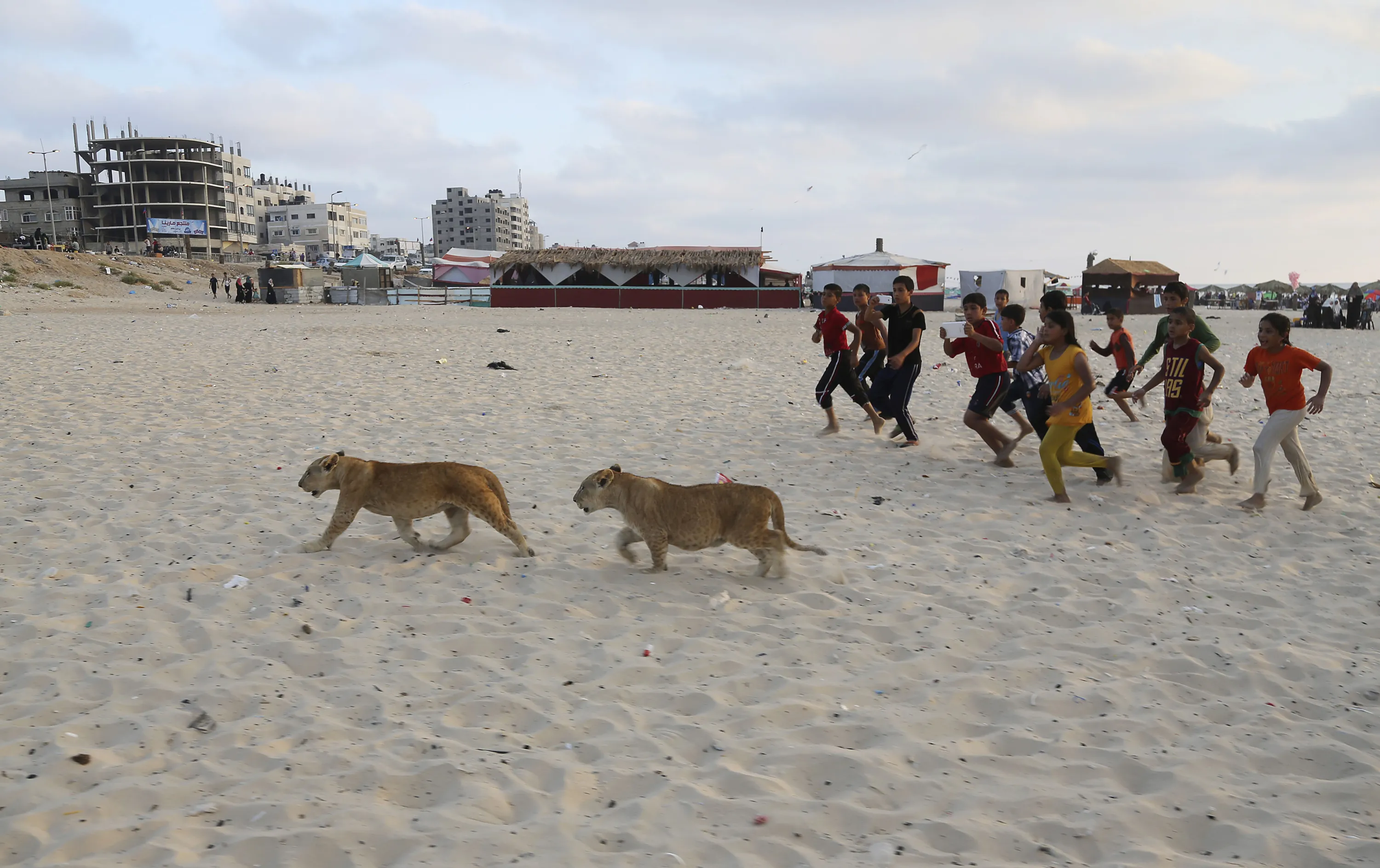 In this Monday, June 15, 2015 photo, lion cubs Mona and Max walk as children run next to them at the beach of Gaza City, in the northern Gaza Strip. (Photo by Adel Hana/AP Photo)