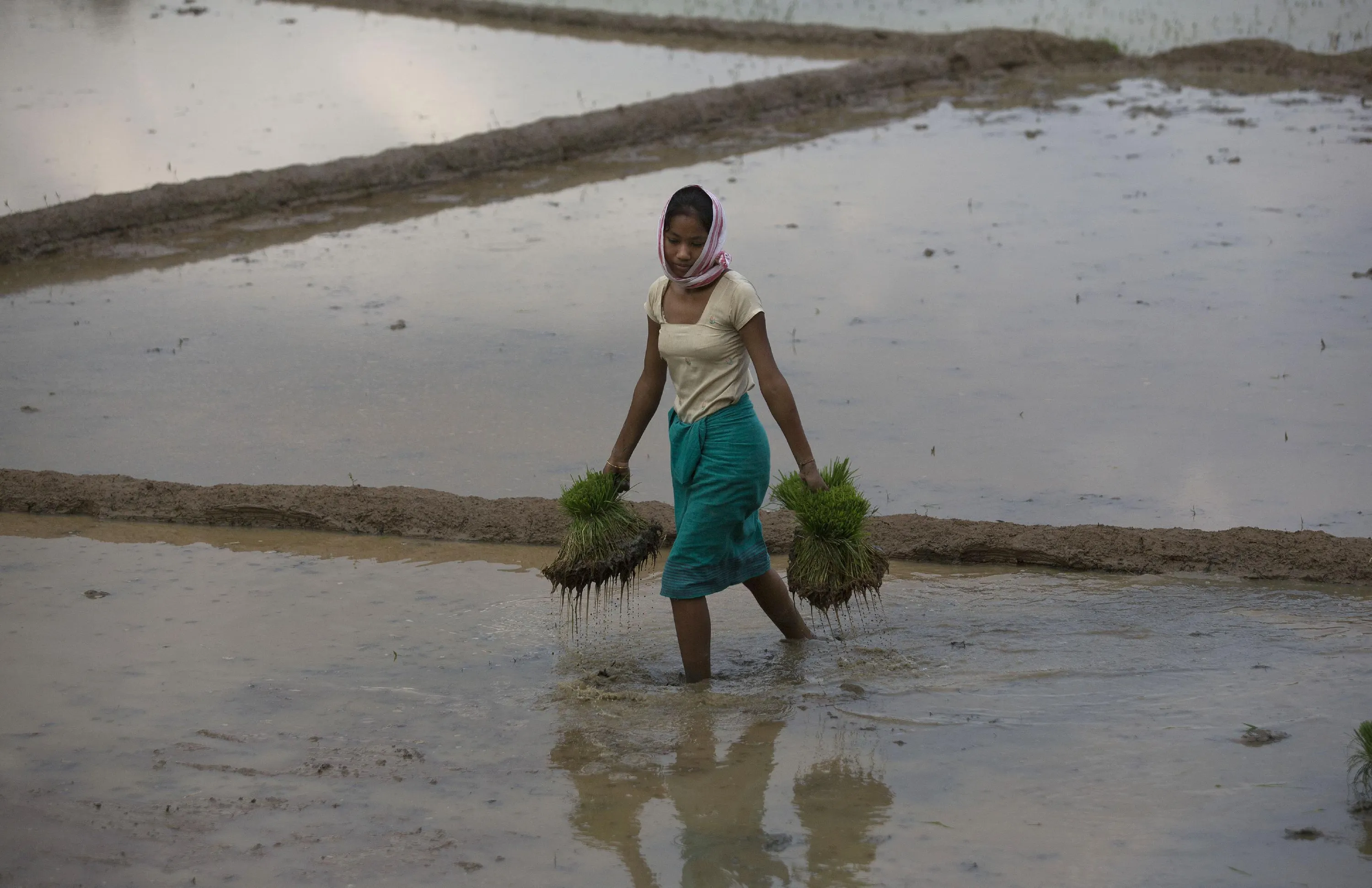 A woman carries saplings to be planted at a paddy field at Reba Maheswar village, 56 kilometers (35 miles) east of Gauhati, India, Friday, July 3, 2015. (Photo by Anupam Nath/AP Photo)