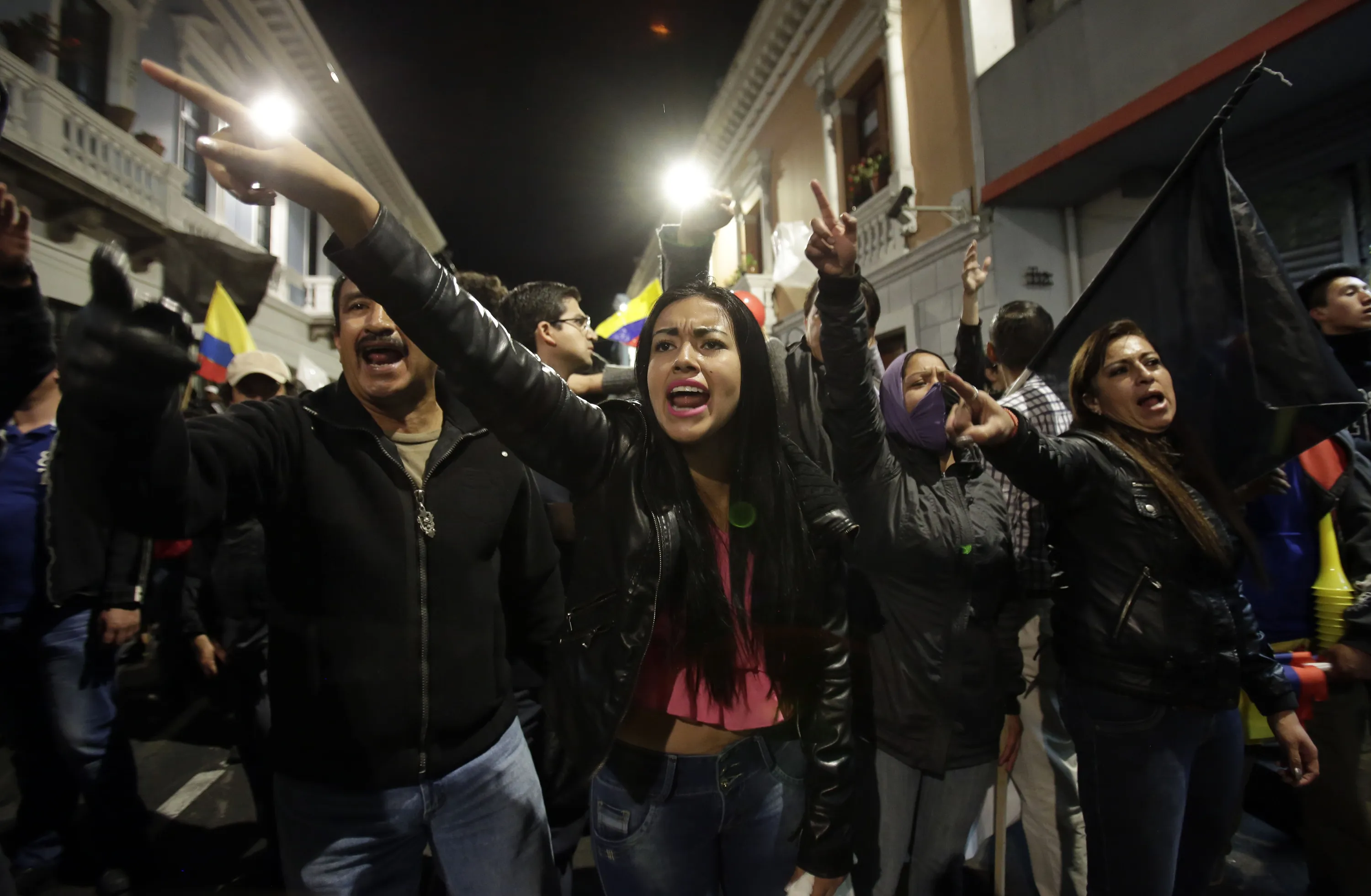 Protesters shout slogans against President Rafael Correa during an opposition march to the president's office in Quito, Ecuador, late Thursday, July 2, 2015. People turned out for protest marches across Ecuador to call for Correa's ouster just three days before a visit by Pope Francis. (Photo by Dolores Ochoa/AP Photo)