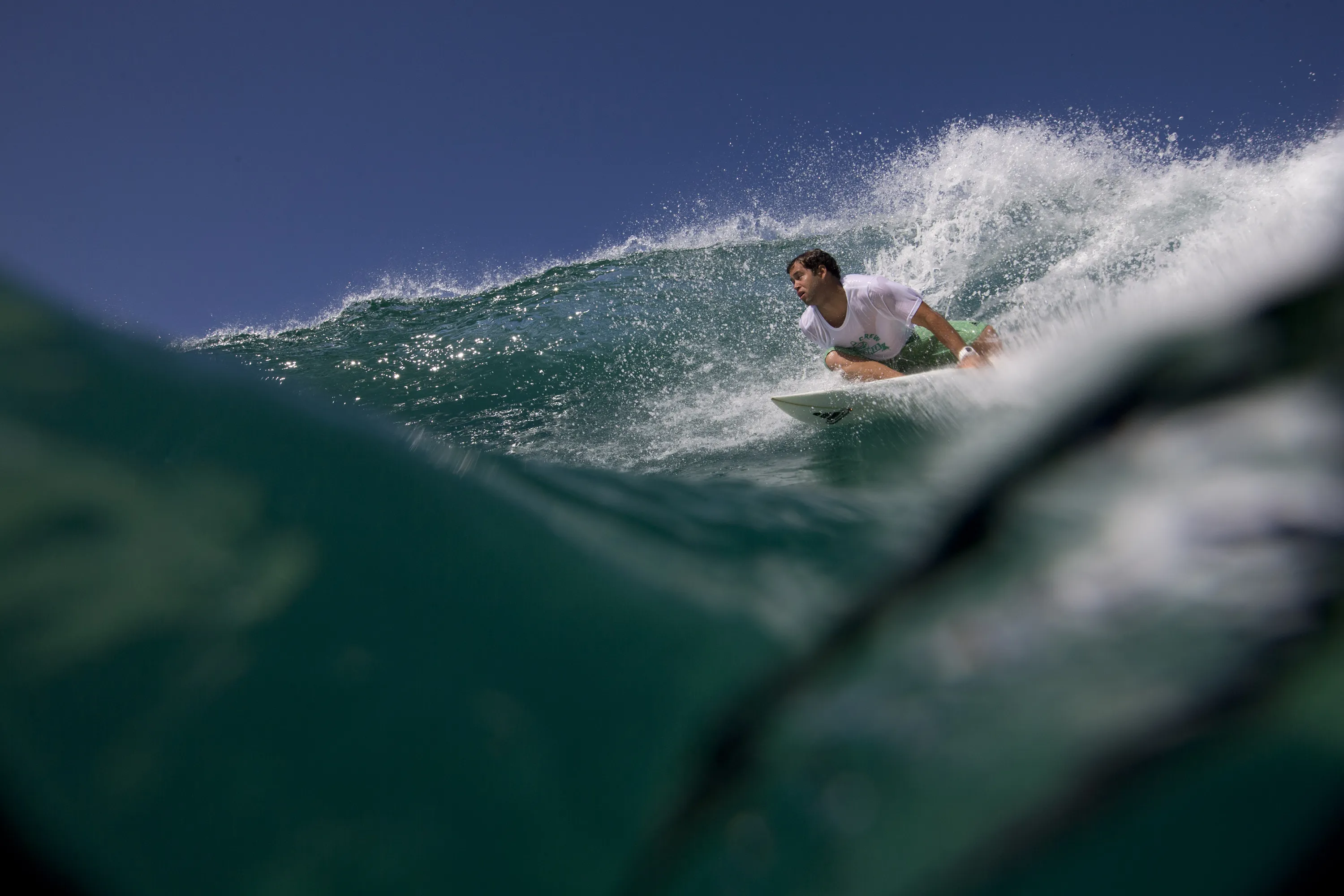 In this June 10, 2015 photo, Magno Neves surfs at Arpoador beach in Rio de Janeiro, Brazil. Neves, a 23-year-old from the Cantagalo slum, surfs nearly every day at the nearby Arpoador beach. He discovered the sport at age 8 after a surf teacher spotted him skateboarding in the slum and taught him how to surf. (Photo by Felipe Dana/AP Photo)