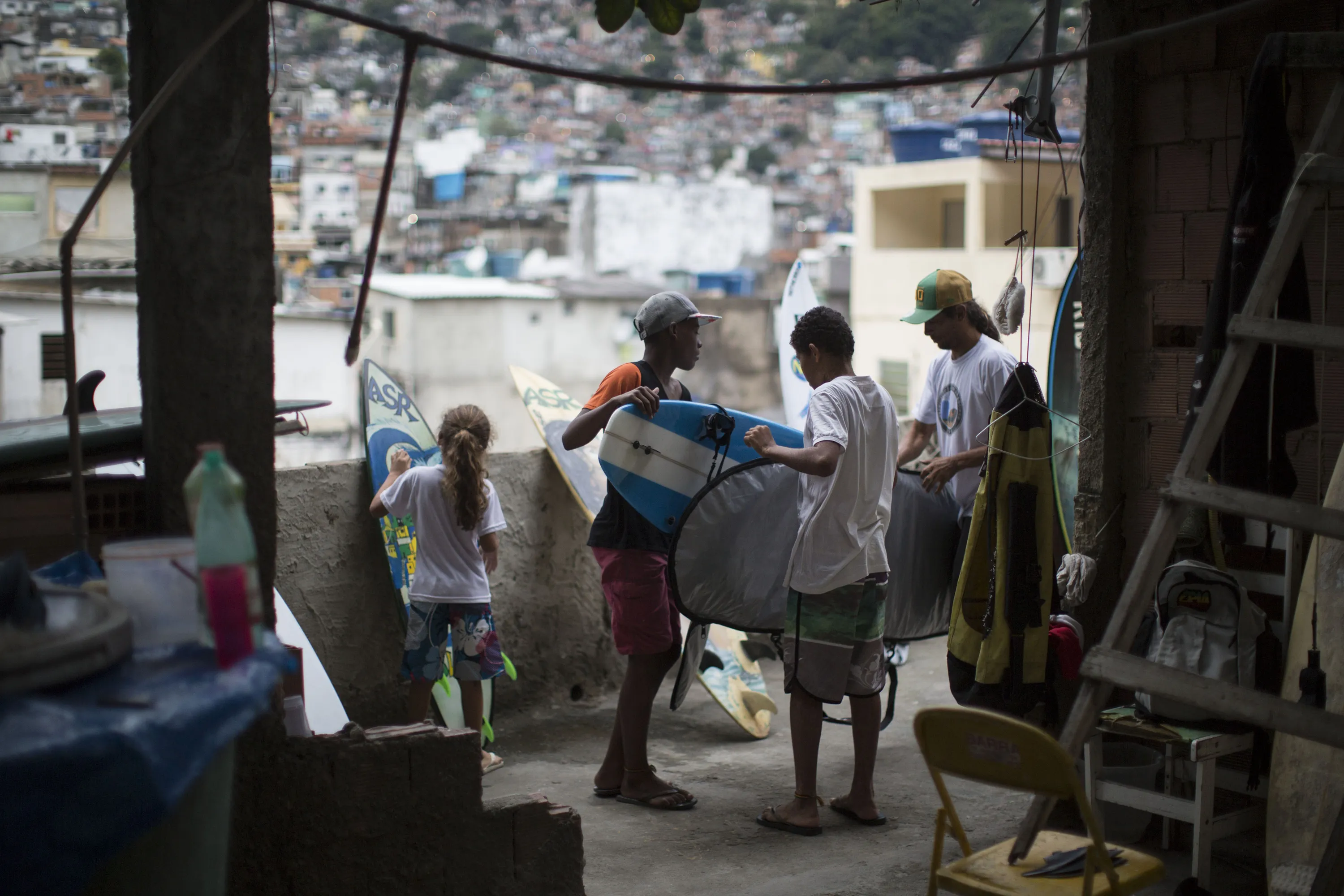 Marcio Pereira da Silva, right, founder of the Rocinha Surf Association, ASR, is helped by young surfers as they store boards at their headquarters at Rocinha slum in Rio de Janeiro, Brazil, Thursday, July 2, 2015. ASR has given free lessons to over 2,000 children from Rio's shantytowns in the hopes of keeping the boys, who are mostly in their early teens and a few girls occupied by the sport and off the streets. (Photo by Felipe Dana/AP Photo)