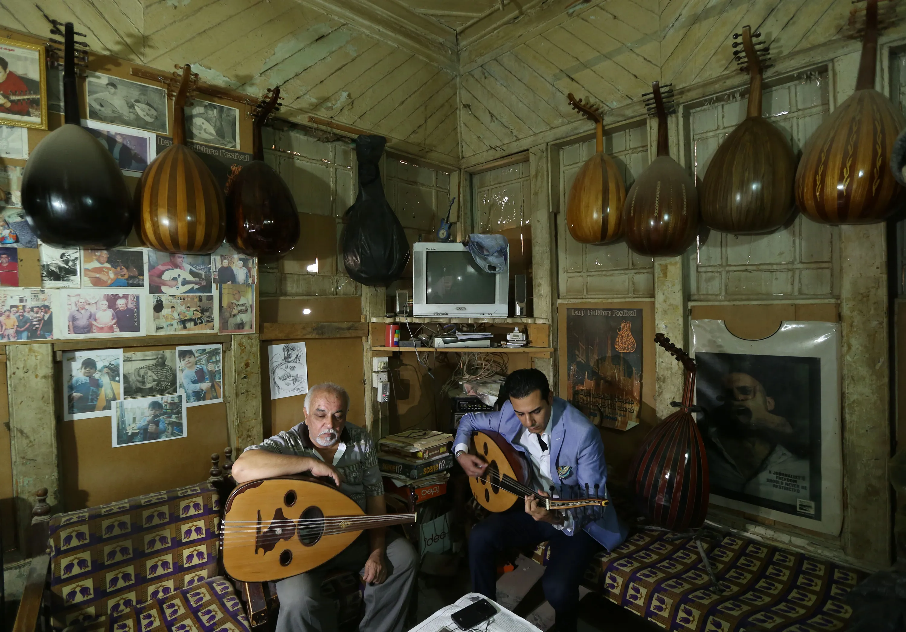 In this photo taken Thursday, June 18, 2015, Bassam Salim, right, and Mahmoud Abdulnabi , left, play on ouds at Abdulnabi's workshop in Baghdad, Iraq. The Islamic State group has banned music in the third of Iraq under its control, but in Baghdad a growing number of musicians and other artists are defying the extremists, hoping to revive a rich culture smothered by decades of war. (Photo by Hadi Mizban/AP Photo)