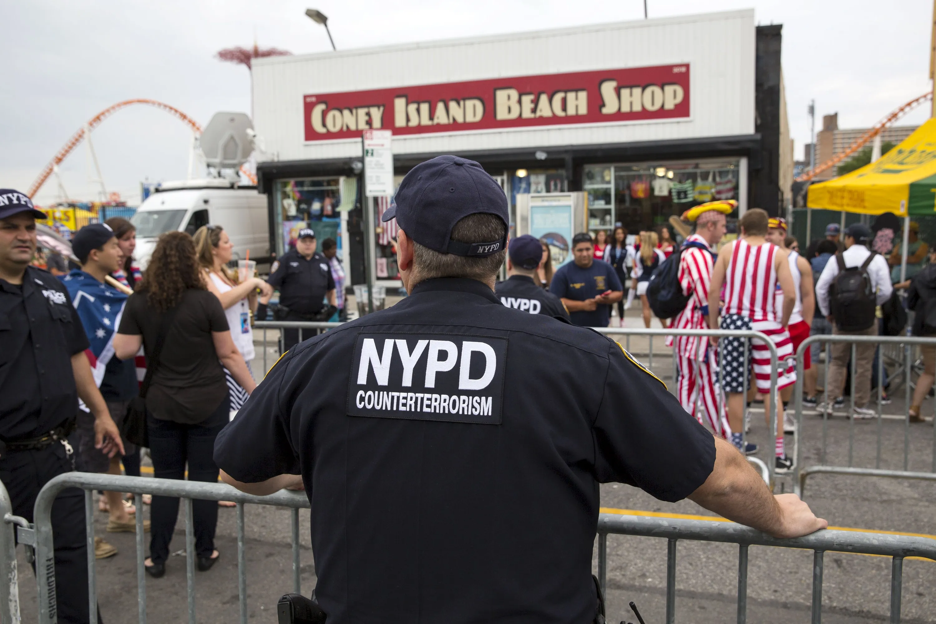 A New York Police Officer watches crowds before the annual Fourth of July 2015 Nathan's Famous Hot Dog Eating Contest in Brooklyn, New York July 4, 2015. (Photo by Andrew Kelly/Reuters)